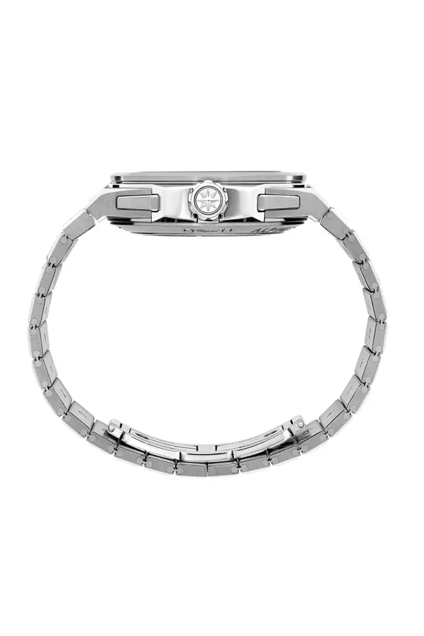 The highlight of the watch is its blue analog dial with a texture inspired by Alpine glaciers. Three subdials, luminous hands and indexes, and a date window create a dynamic and functional display. The look is completed by a steel bracelet in silver tone with a secure folding clasp.