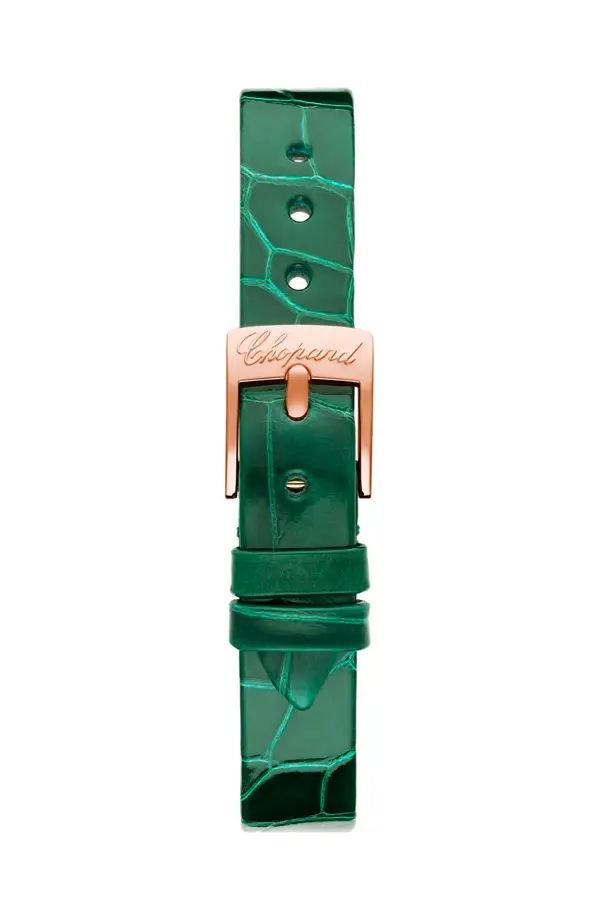 The round 25.8 mm case crafted from 18-carat rose gold is adorned with a diamond-set bezel, enhancing the brilliance of the watch. The green mother-of-pearl dial radiates calm elegance, while delicate gold hands and floating diamonds add a jewellery-like charm. The sapphire crystal ensures clarity and exceptional scratch resistance.