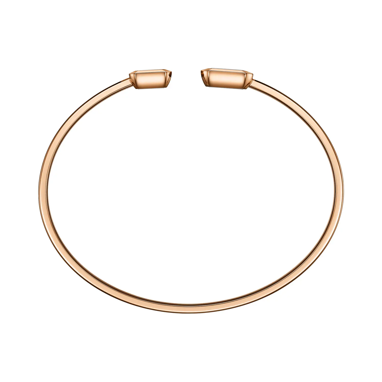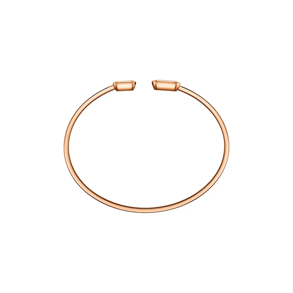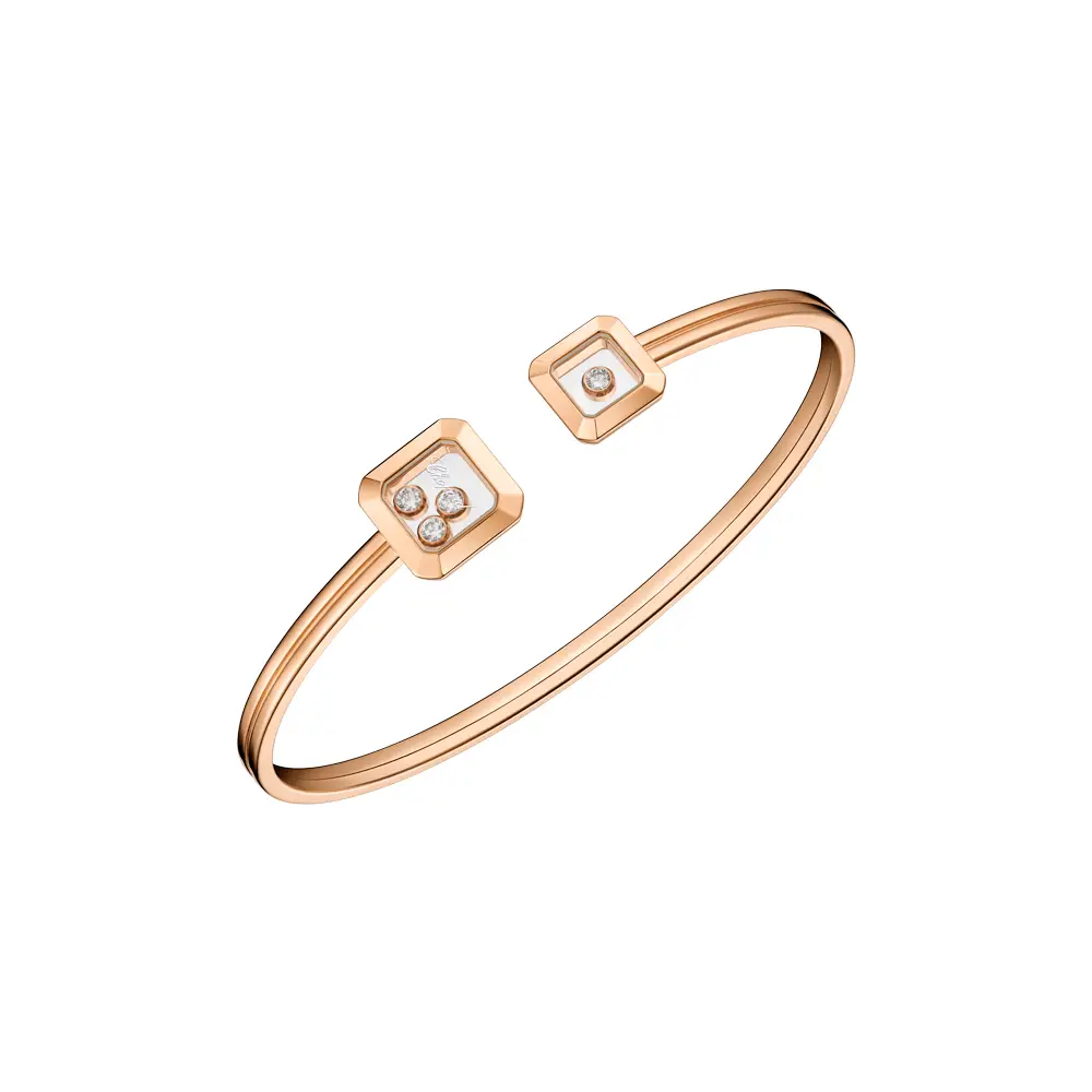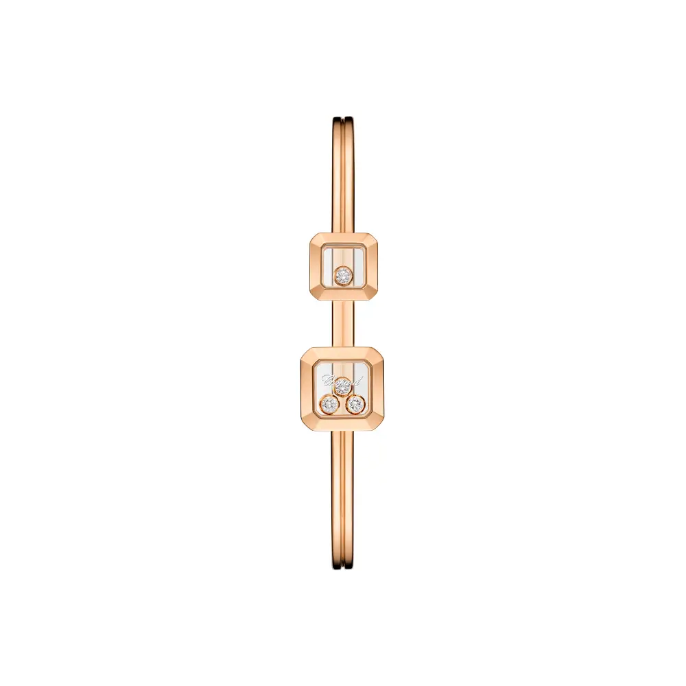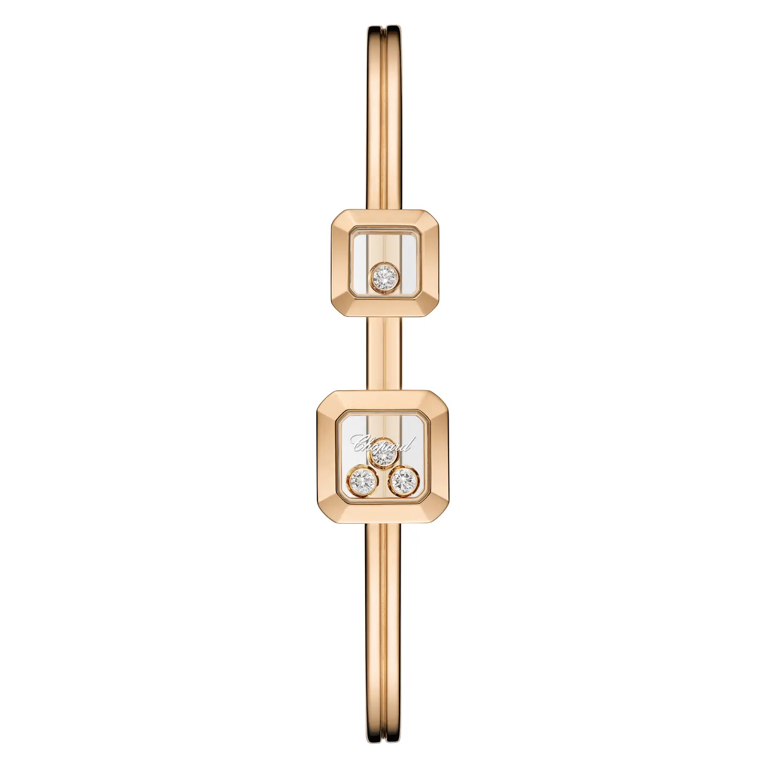 Chopard Happy Diamonds Icons Bangle 85A114-5002 celebrates joy, movement, and feminine elegance. Crafted from 18-carat ethical rose gold, this delicate bangle exudes a warm, romantic glow. At its heart are free-moving diamonds enclosed between two sapphire crystals, dancing gracefully with every wrist movement – an iconic Happy Diamonds signature that embodies freedom and the joy of life.