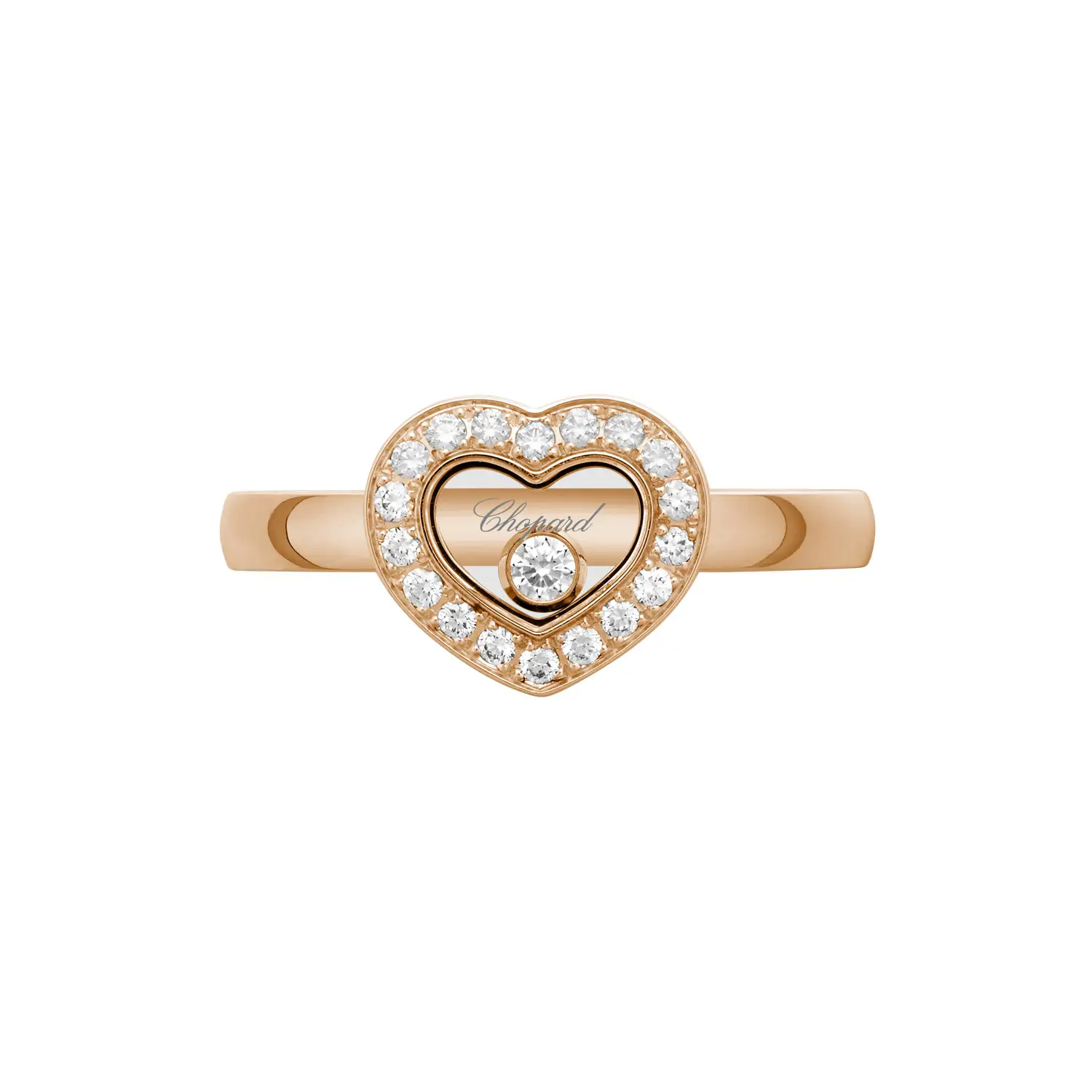 The Chopard Happy Diamonds 82A054-5211 ring radiates the lightness, sparkle, and elegance that define this iconic collection. Crafted from 18k ethical rose gold, it is adorned with 19 brilliant-cut diamonds totaling approximately 0.19 ct, freely moving between two sapphire crystals — the hallmark of the Happy Diamonds design, symbolizing joy, freedom, and vitality.