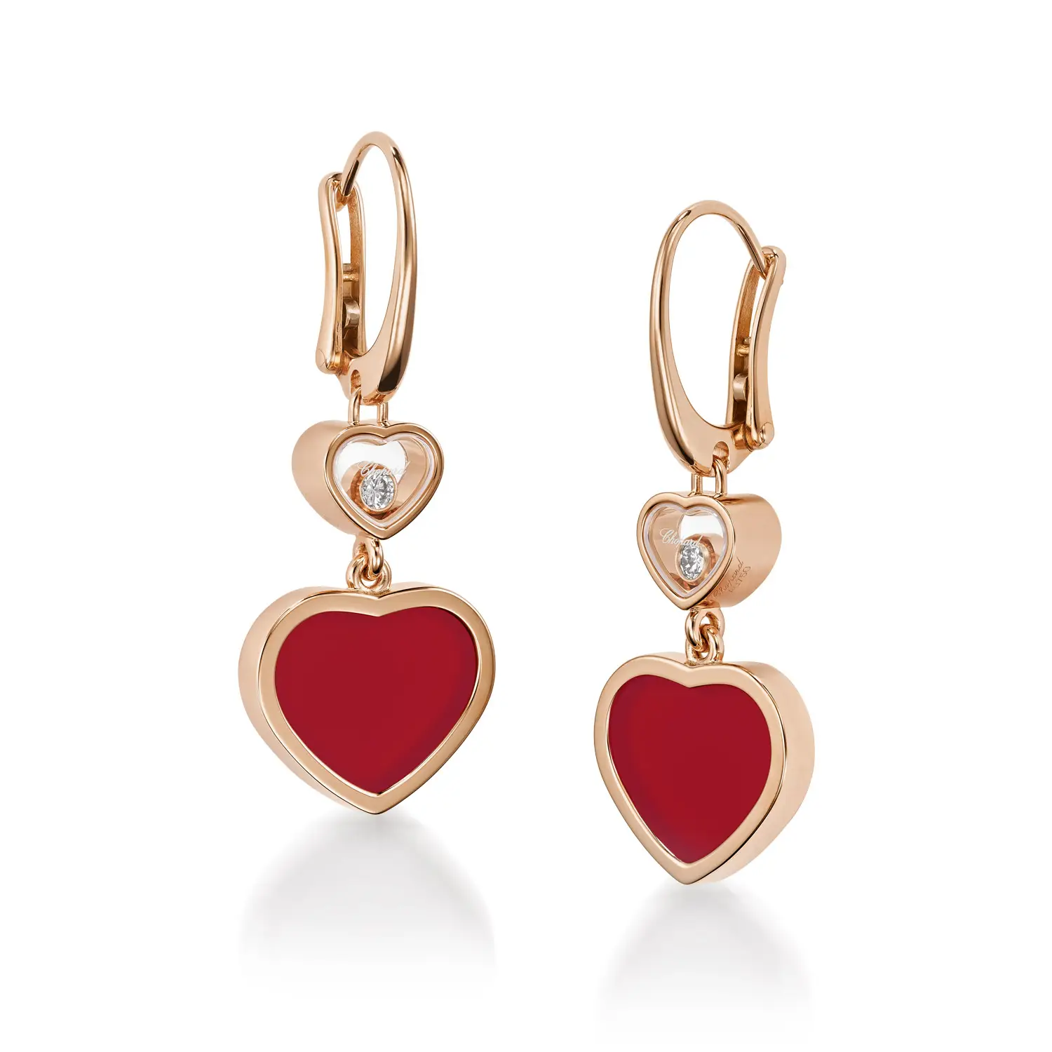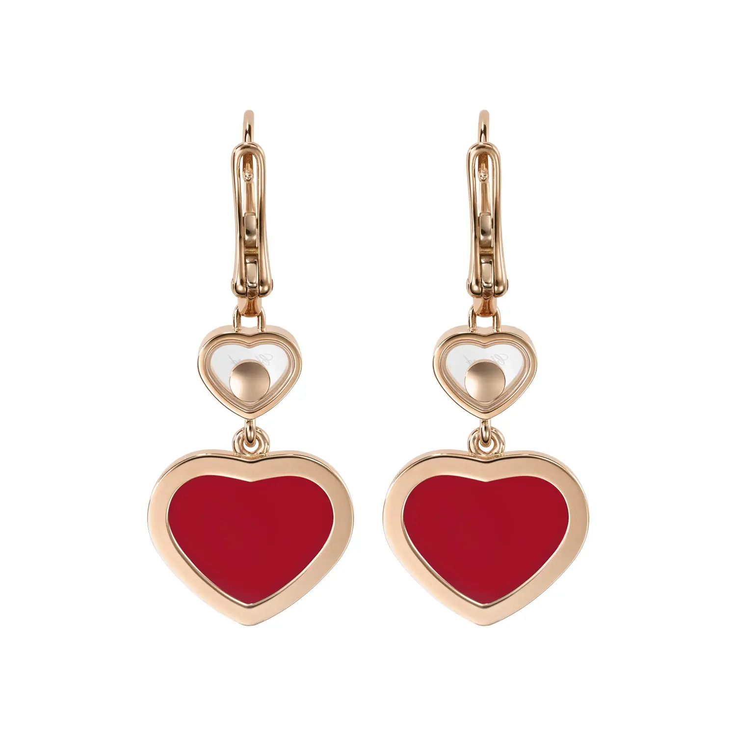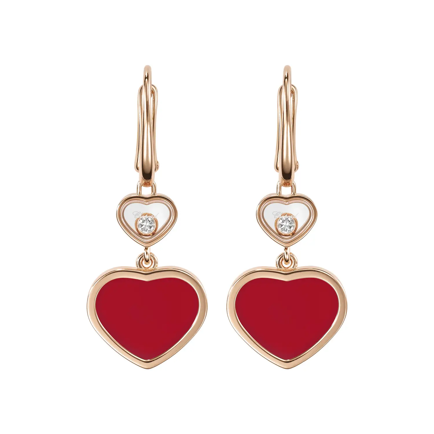 A standout feature is the heart-shaped carnelian, whose rich red hue adds depth and joyful character typical of the Happy Hearts collection. The earrings offer a subtle yet distinctive presence, making them a perfect luxury accessory or a meaningful gift with emotional resonance.