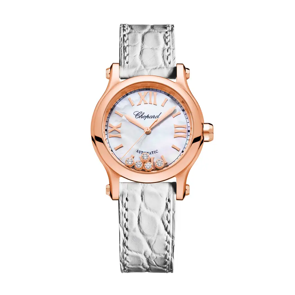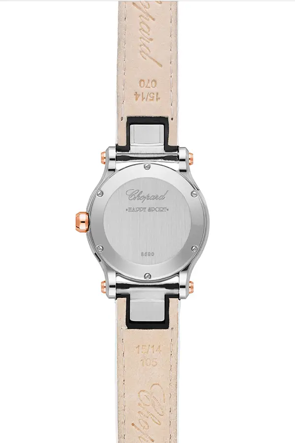 Feminine elegance at its finest – the Chopard Happy Sport 274893-5009 is a brilliant expression of how luxury can be gentle, sophisticated, and playful all at once. The 30 mm round case is crafted entirely from 18k rose gold, radiating warmth and timeless beauty.