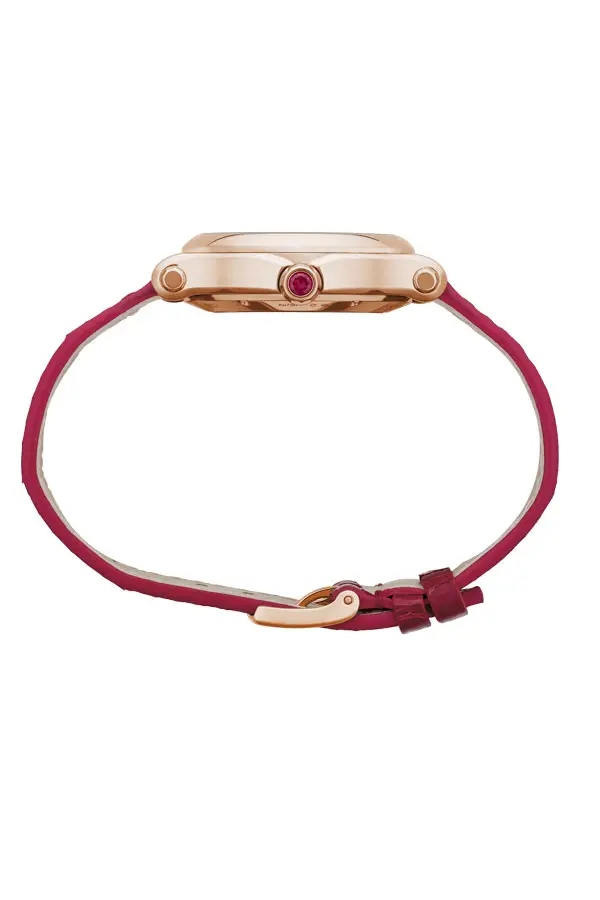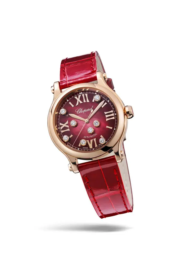 Its 33 mm case crafted from 18k rose gold protects a red dial adorned with Roman numerals and eight freely moving diamonds that glide gracefully between two sapphire crystals, reflecting light with every motion. The anti-reflective sapphire glass ensures clarity and durability, while the red alligator leather strap with pin buckle adds a touch of sophistication.