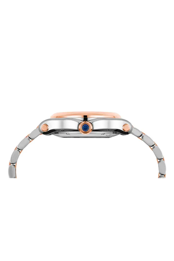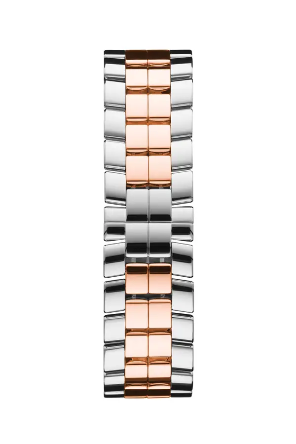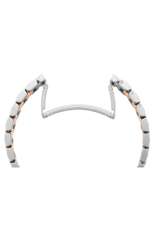 Completing the look is a two-tone bracelet in steel and 18k rose gold, secured with a folding clasp for comfort and confidence on the wrist.