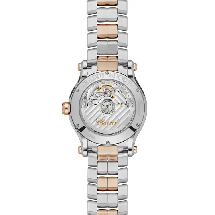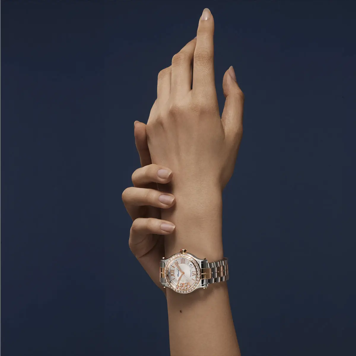 The bracelet combining stainless steel and 18k rose gold strikes a perfect balance between classic beauty and contemporary sophistication. The Chopard Happy Sport 278559-6025 is not just a timepiece but a jewel for the wrist, expressing elegance, personality and joy in every moment.