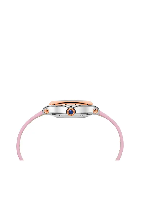 The 30 mm round stainless steel case is framed by an elegant 18k rose gold bezel, encircling a pink dial full of charm. The matching pink alligator leather strap adds a graceful tone-on-tone finish. A sapphire crystal protects the dial while enhancing its brilliance.