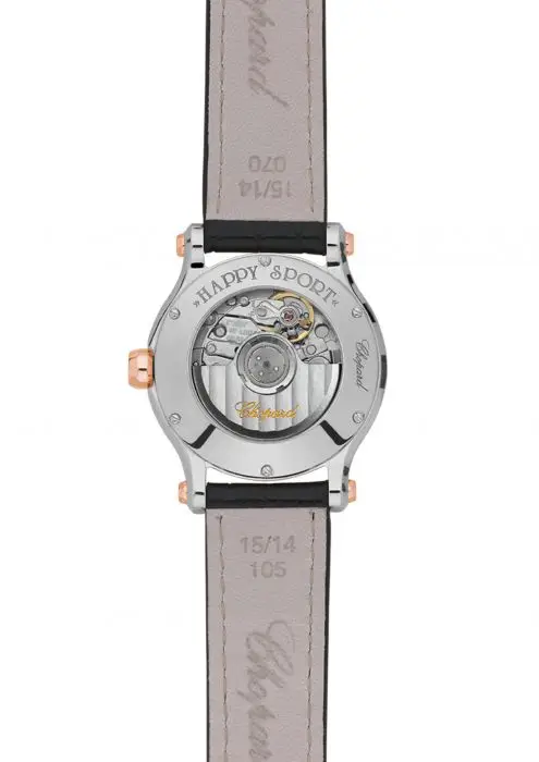 Beneath the sapphire crystal lies a silver-tone dial with free-floating diamonds – an emblematic hallmark of the Happy Sport collection. These sparkling stones dance freely between two sapphire glasses, creating mesmerizing reflections and a sense of playful refinement. With 30-meter water resistance, the watch is ideal for elegant everyday wear.