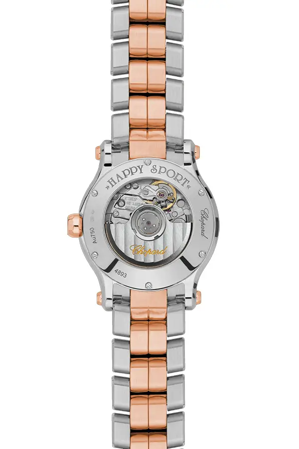 The Chopard Happy Sport 278573-6021 masterfully blends feminine charm with Swiss precision. This standout bicolor edition shines with luxury, thanks to a refined combination of stainless steel and 18k rose gold, crowned by a diamond-set bezel that draws every eye.