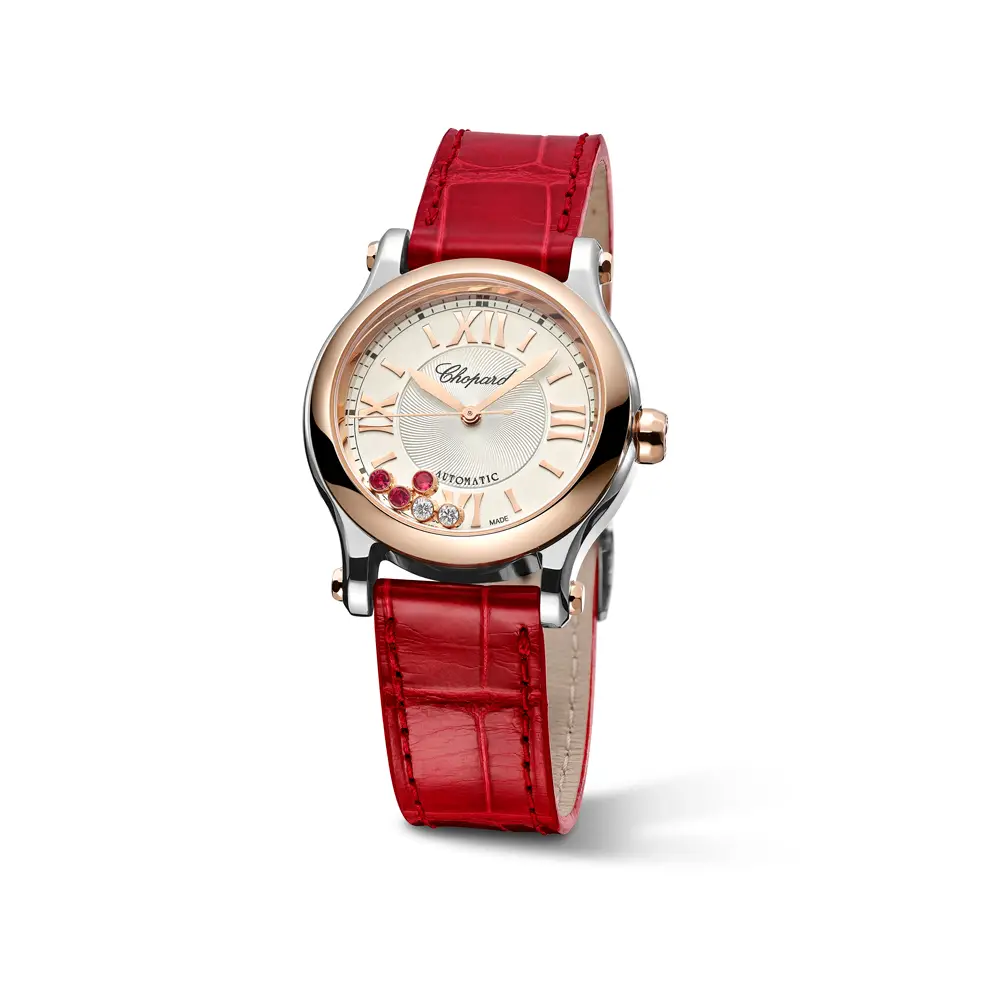 The round case measuring 30 mm is made of stainless steel and framed by an 18kt rose gold bezel, adding a warm, luxurious glow. Beneath the sapphire crystal, a silver dial sparkles with freely moving diamonds, which respond to every movement of the wrist and bring sparkle to each moment.