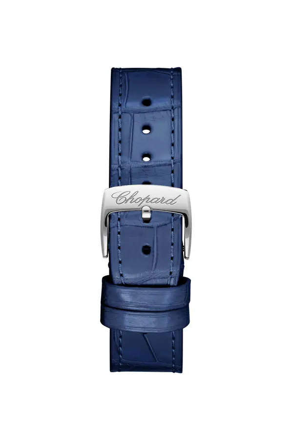 The matching blue alligator leather strap adds both style and comfort, fastened securely with a tang buckle.