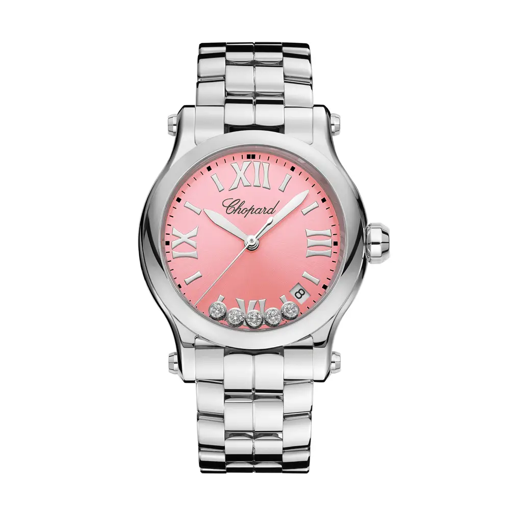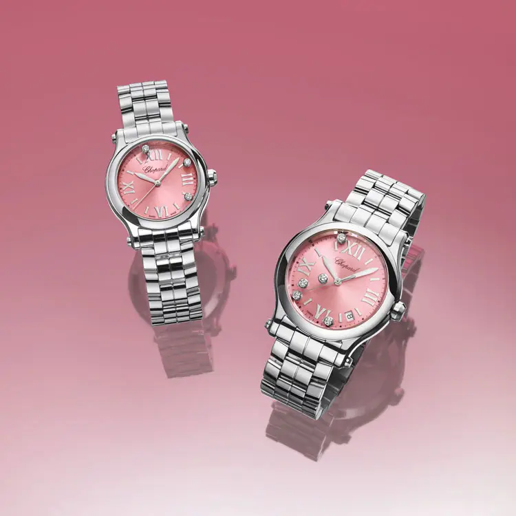 The soft pink dial brings a subtle touch of sophistication, serving as the perfect backdrop for Chopard’s signature floating diamonds that dance freely between two sapphire crystals. With every movement, they sparkle brilliantly – a symbol of playfulness, freedom, and feminine energy.