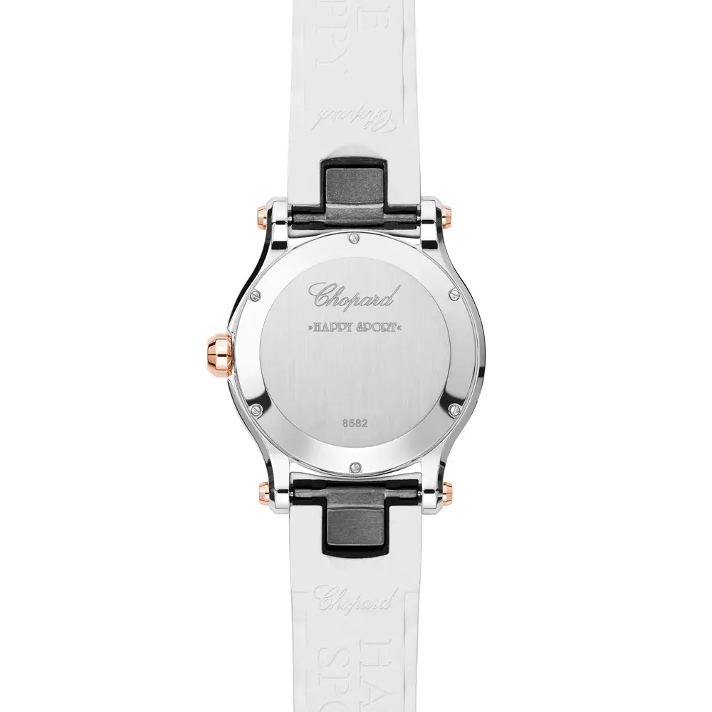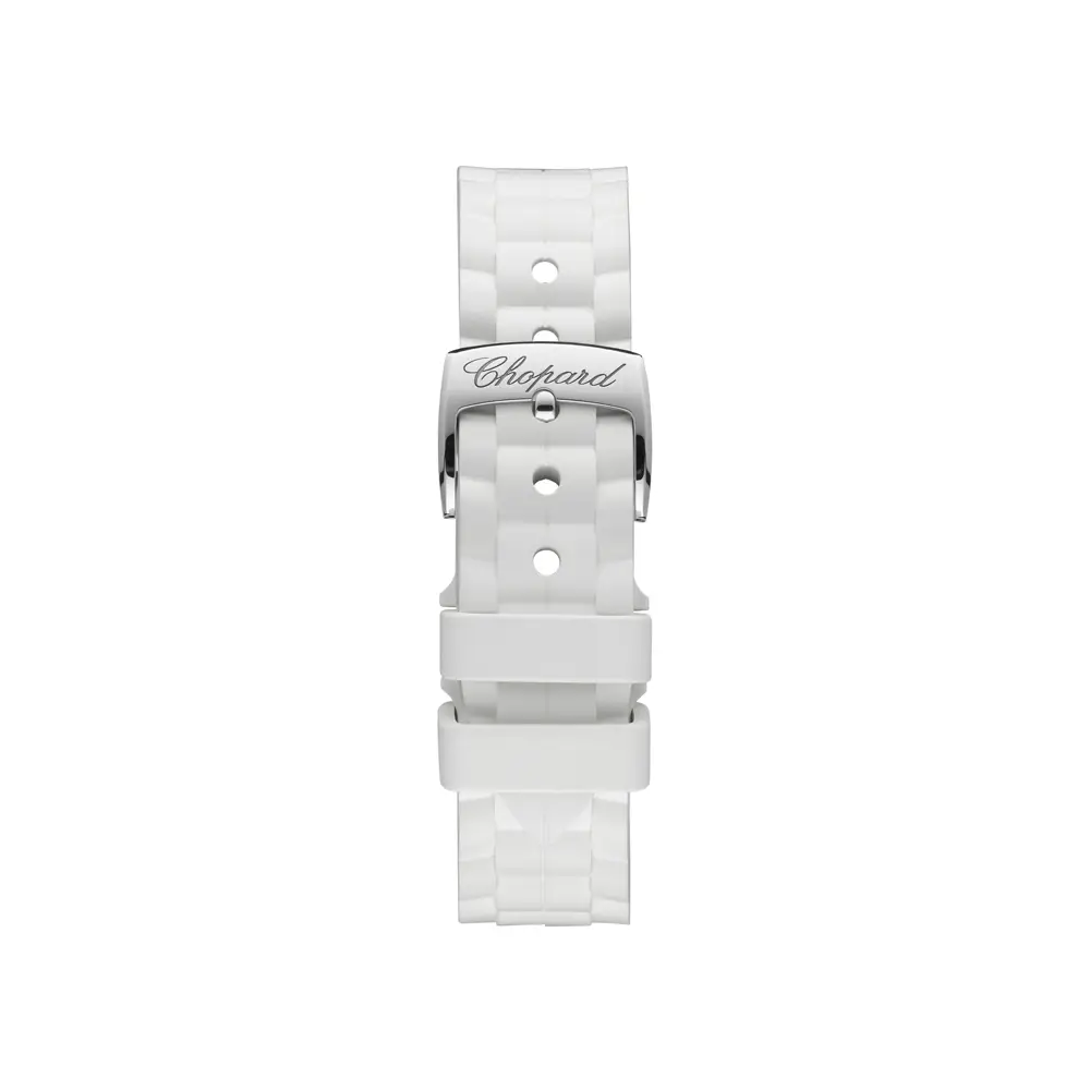 Powered by a Swiss quartz movement, it offers exceptional precision without the need for winding. The white rubber strap adds a fresh, sporty elegance, while the pin buckle ensures secure and comfortable wear. The Chopard Happy Sport 278582-6001 is more than a watch – it is a jewel of joy, femininity and freedom, transforming every moment into brilliance.