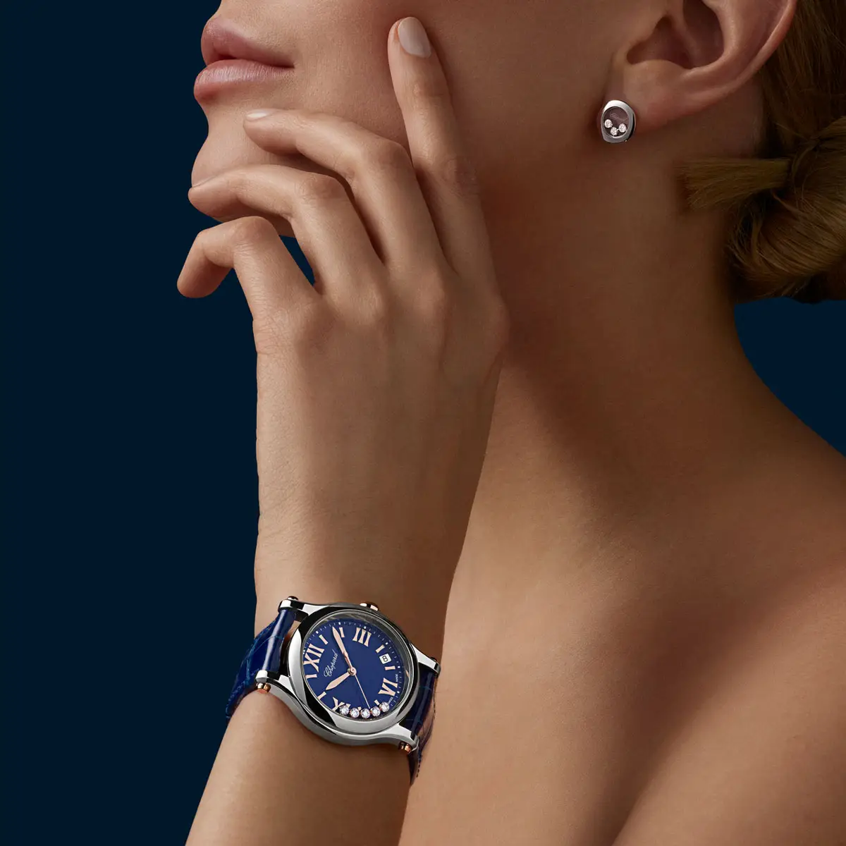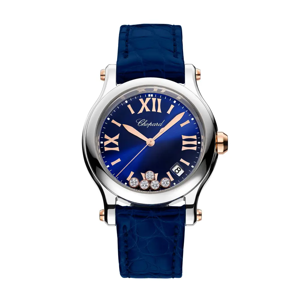 Its 36 mm stainless steel case features a finely fluted steel bezel protected by anti-reflective sapphire crystal. The blue dial with a subtle date display at 4 o’clock is refined and balanced, while five freely moving diamonds add the unmistakable touch of Happy Sport — a celebration of joy and motion. With 30-meter water resistance, this watch is perfect for effortless everyday wear.