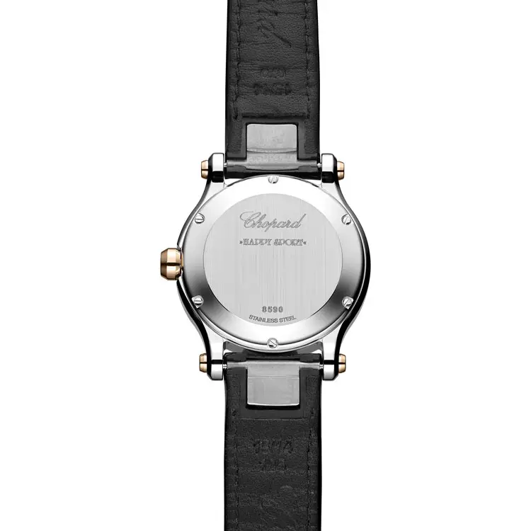 The Chopard Happy Sport 278582‑6014 model combines timeless design with subtle luxury. Its round case measures 36 mm and is crafted from durable stainless steel, exuding elegance and robustness. The front is protected by sapphire crystal, ensuring high resistance to scratches.