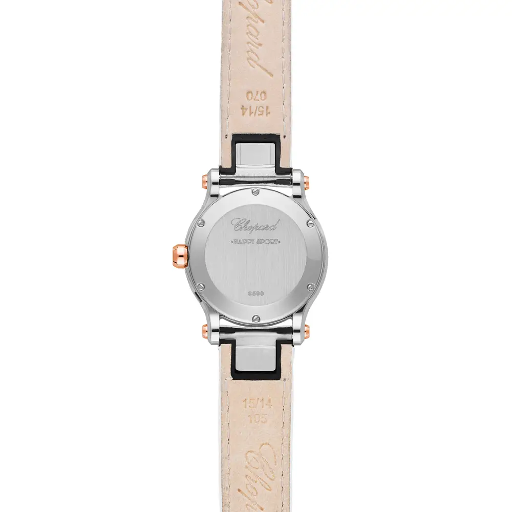 The Chopard Happy Sport 278590-6005 timepiece embodies feminine delicacy, refined detail, and contemporary elegance. Its 30 mm round case crafted from stainless steel and 18k rose gold creates a beautiful harmony between cool shine and warm golden tones.