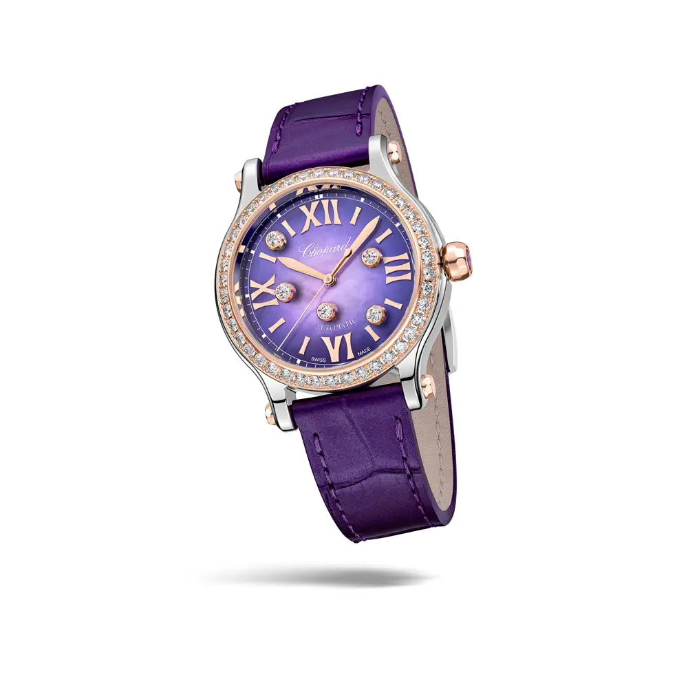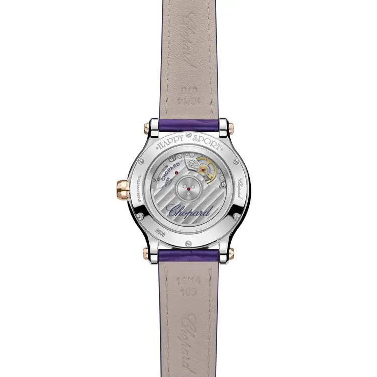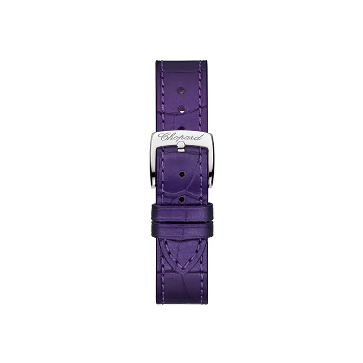 Powered by the automatic calibre CHOPARD 09.01-C with a 42-hour power reserve, it is paired with a purple alligator leather strap and classic pin buckle. With 30 m water resistance, the Happy Sport 278608-6012 embodies luxury, freedom and timeless joie de vivre.