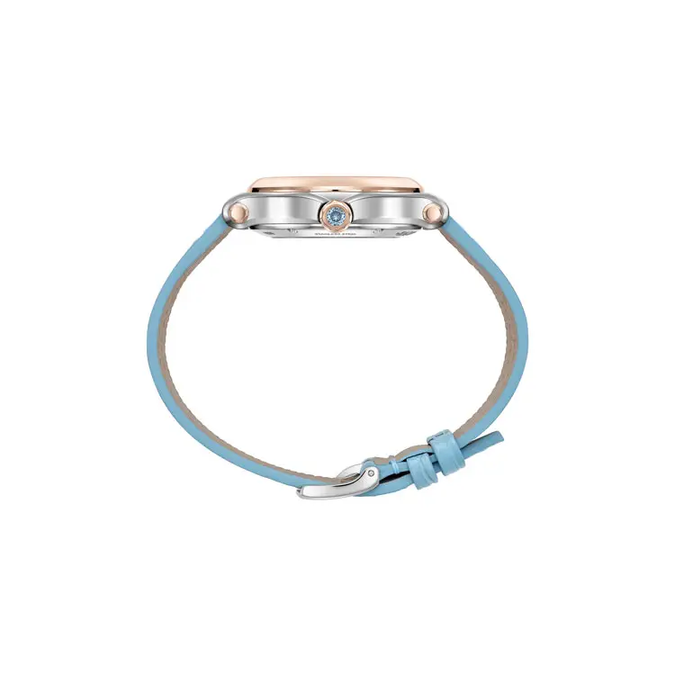The gently curved 33 mm round case is crafted from stainless steel, enhanced by a luxurious 18k rose gold bezel. This combination creates harmony between technical precision and feminine sensuality. The sapphire crystal protects the dial from scratches, while 3ATM / 30M water resistance ensures everyday comfort.