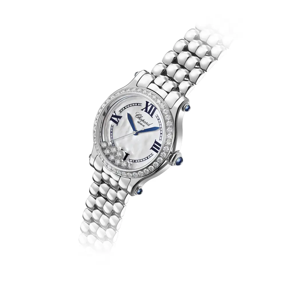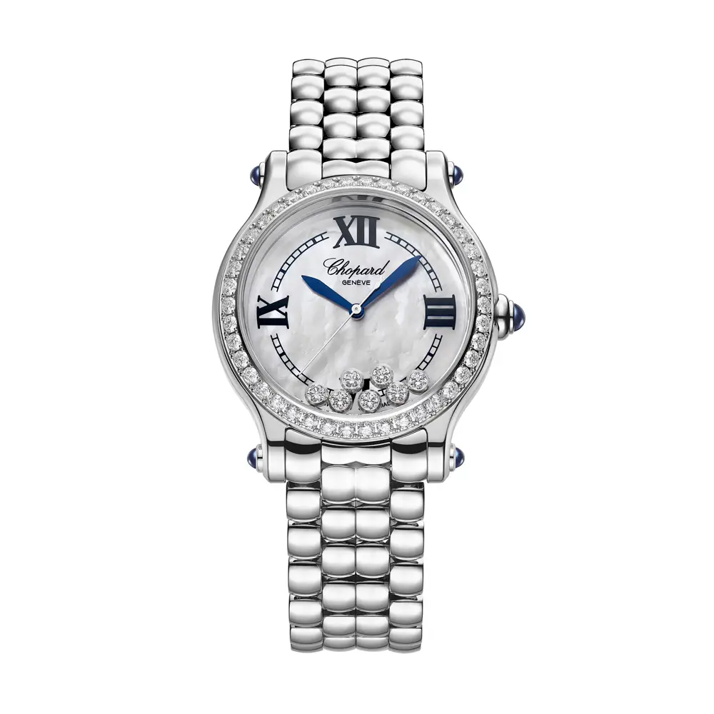 The 33 mm stainless-steel case is adorned with a diamond-set bezel that turns every glance into a special moment. Beneath the sapphire crystal lies a mother-of-pearl dial with free-floating diamonds – an iconic hallmark of the Happy Sport line that brings joy and originality to every movement. With 30-meter water resistance, this timepiece is ideal for daily elegance and ease.