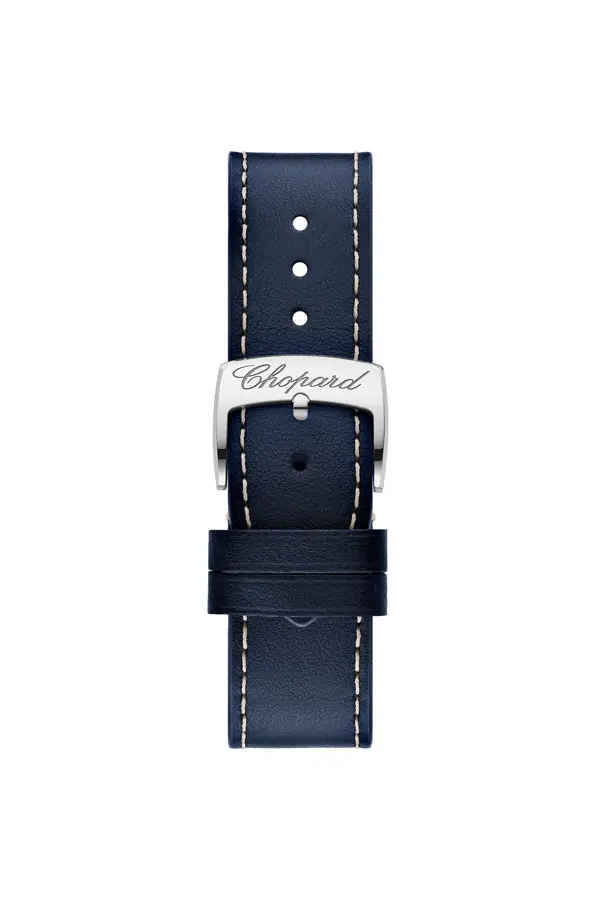 The 40 mm round case made of polished steel is framed by a warm 18kt rose gold bezel, adding refined contrast. Beneath the sapphire crystal, the silver-tone dial shines with Chopard’s signature floating diamonds, dancing with every movement.