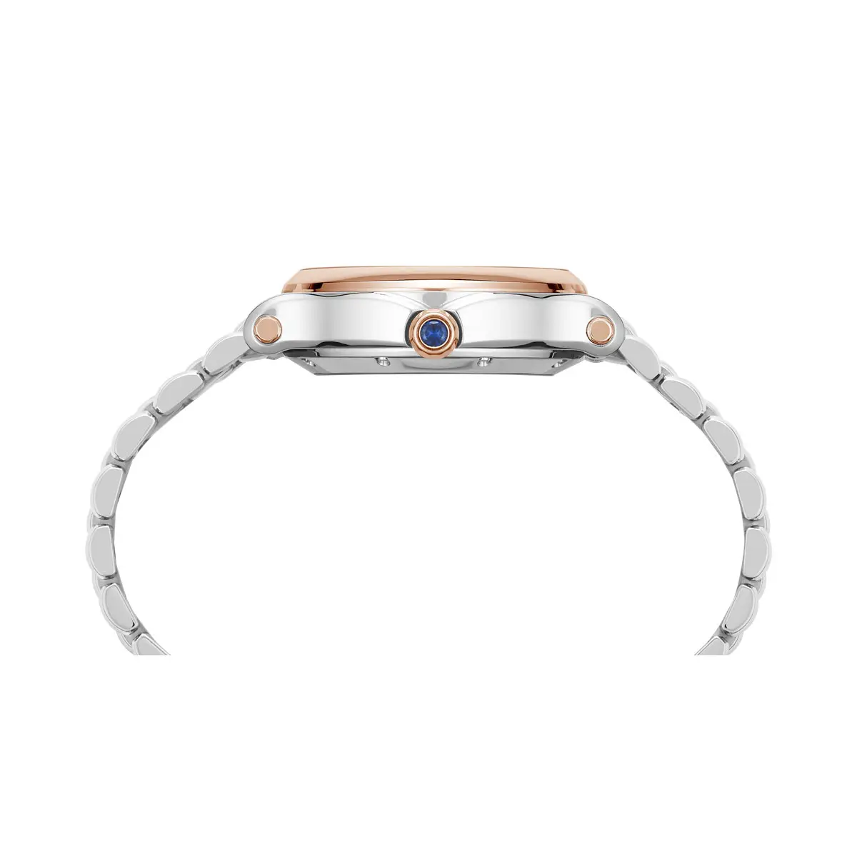 The refined oval case measuring 31.31 x 29 mm is crafted from polished stainless steel, while the 18k rose gold bezel adds a warm, feminine touch. The sapphire crystal ensures durability and scratch resistance, and with 3ATM / 30M water resistance, the watch is ideal for everyday wear.