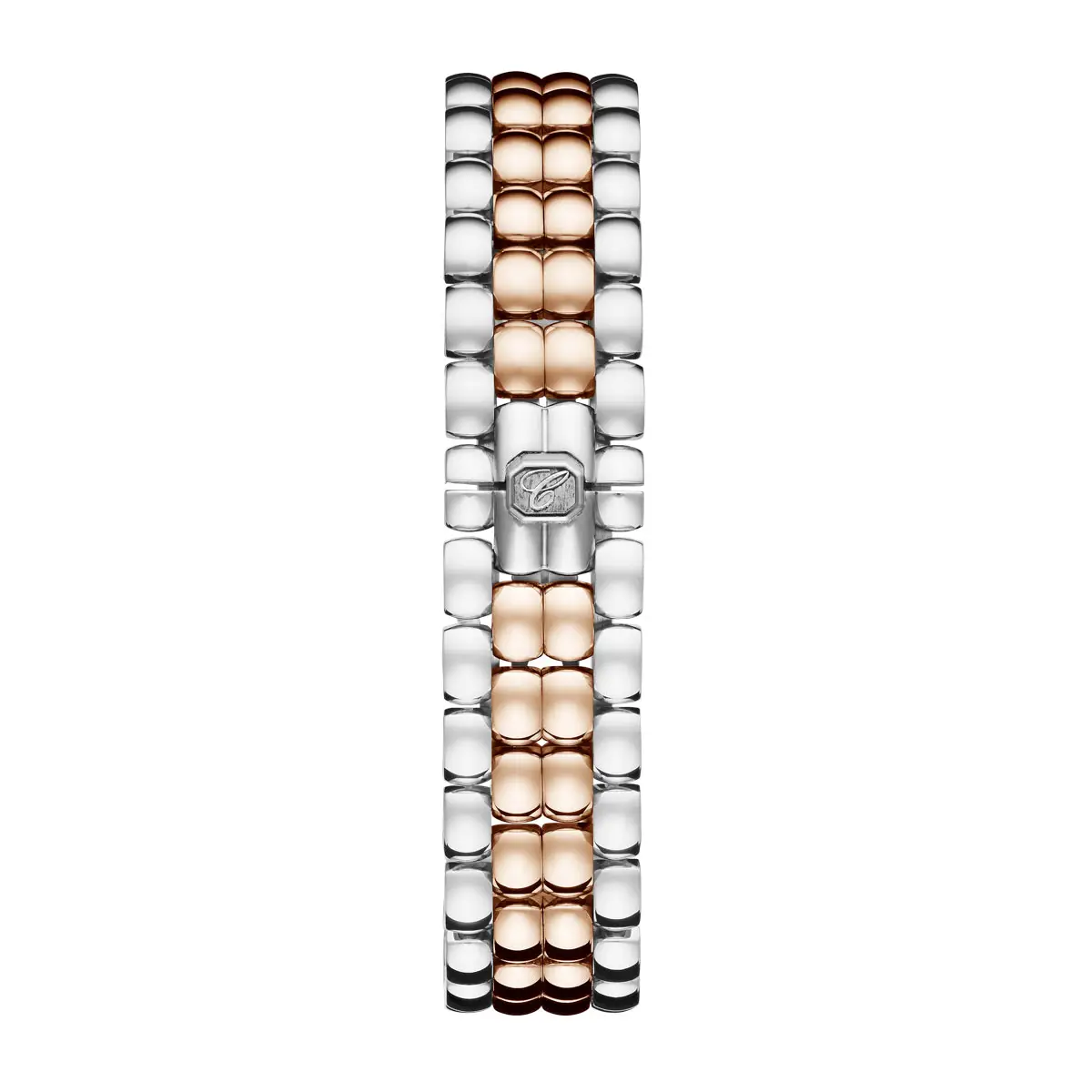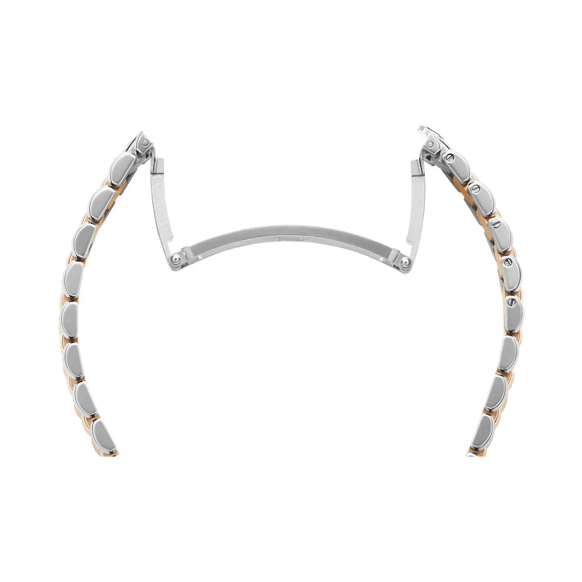 The luxurious bicolor bracelet made of stainless steel and 18k rose gold underscores the watch’s noble character and adds a modern, timeless aesthetic. The folding clasp provides comfort, security, and visual harmony.