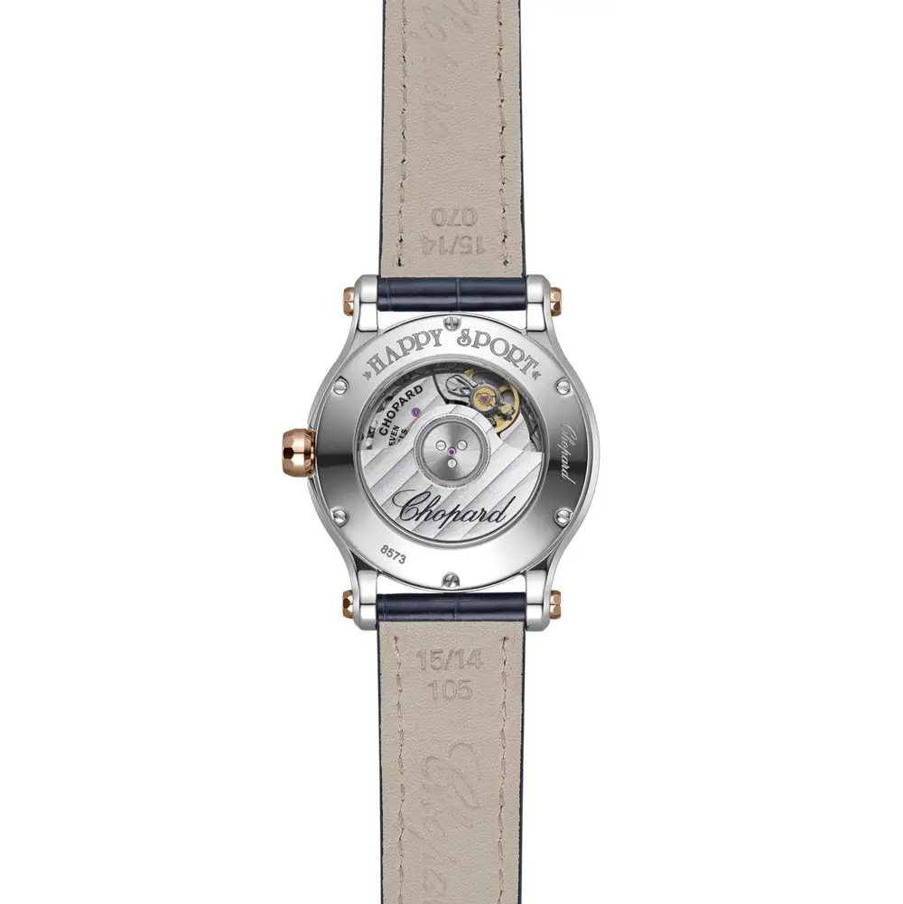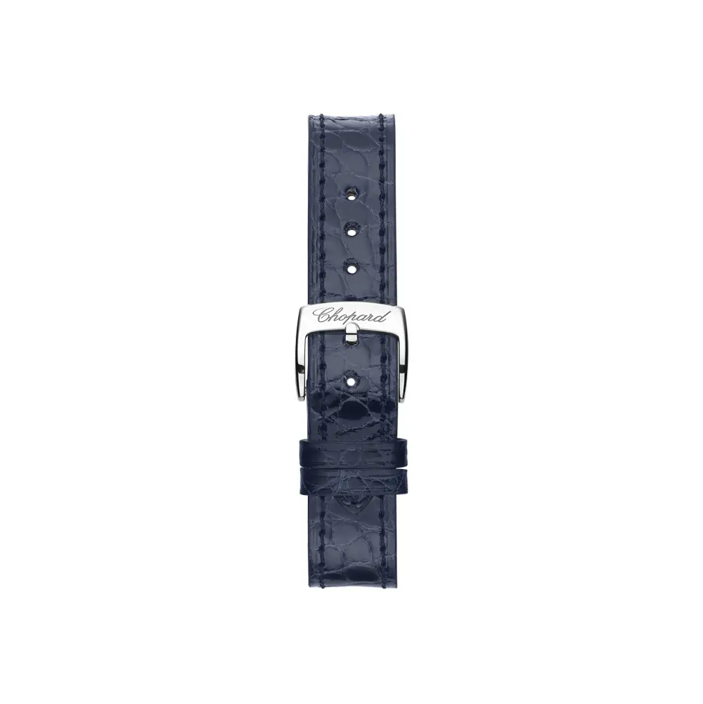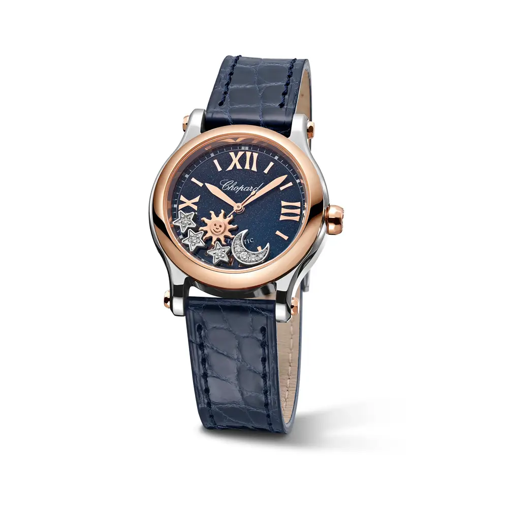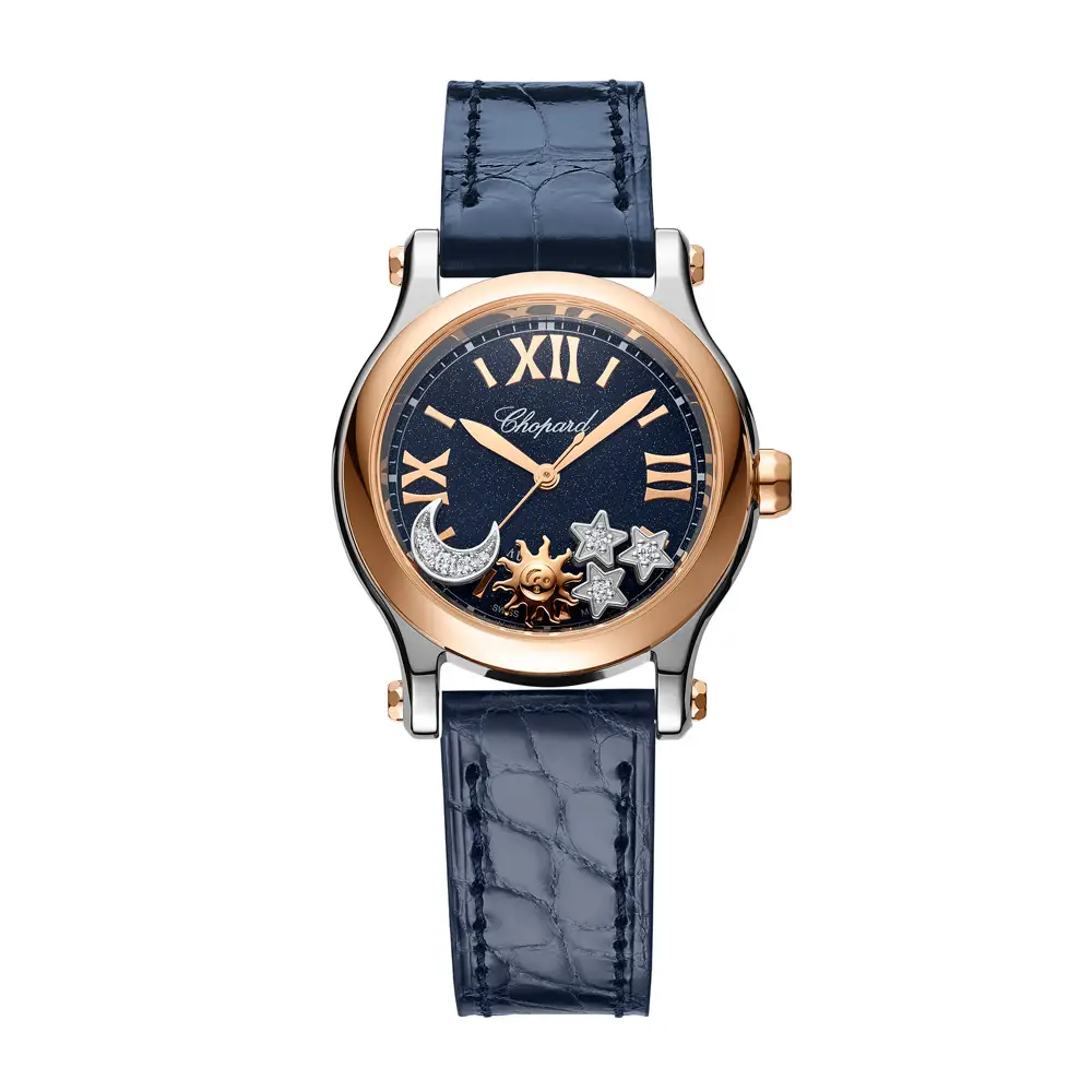 The design is completed by a blue alligator-leather strap with a classic pin buckle, enhancing both comfort and style. Inside beats a Swiss automatic movement, ensuring smooth precision and reliability. The Chopard Happy Sport Sun, Moon and Stars 278573-6027 is more than a timepiece — it is a celestial jewel, a poetic reminder that feminine style shines as brightly and infinitely as the stars above.