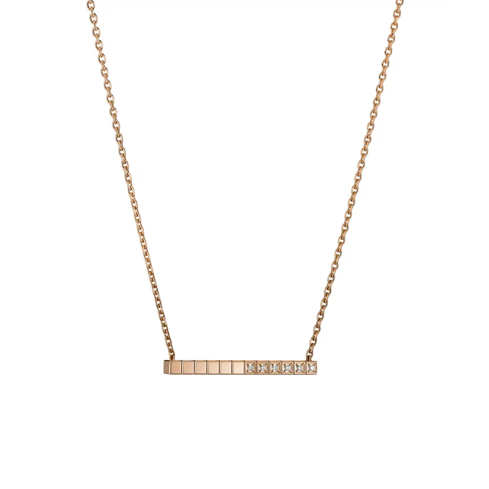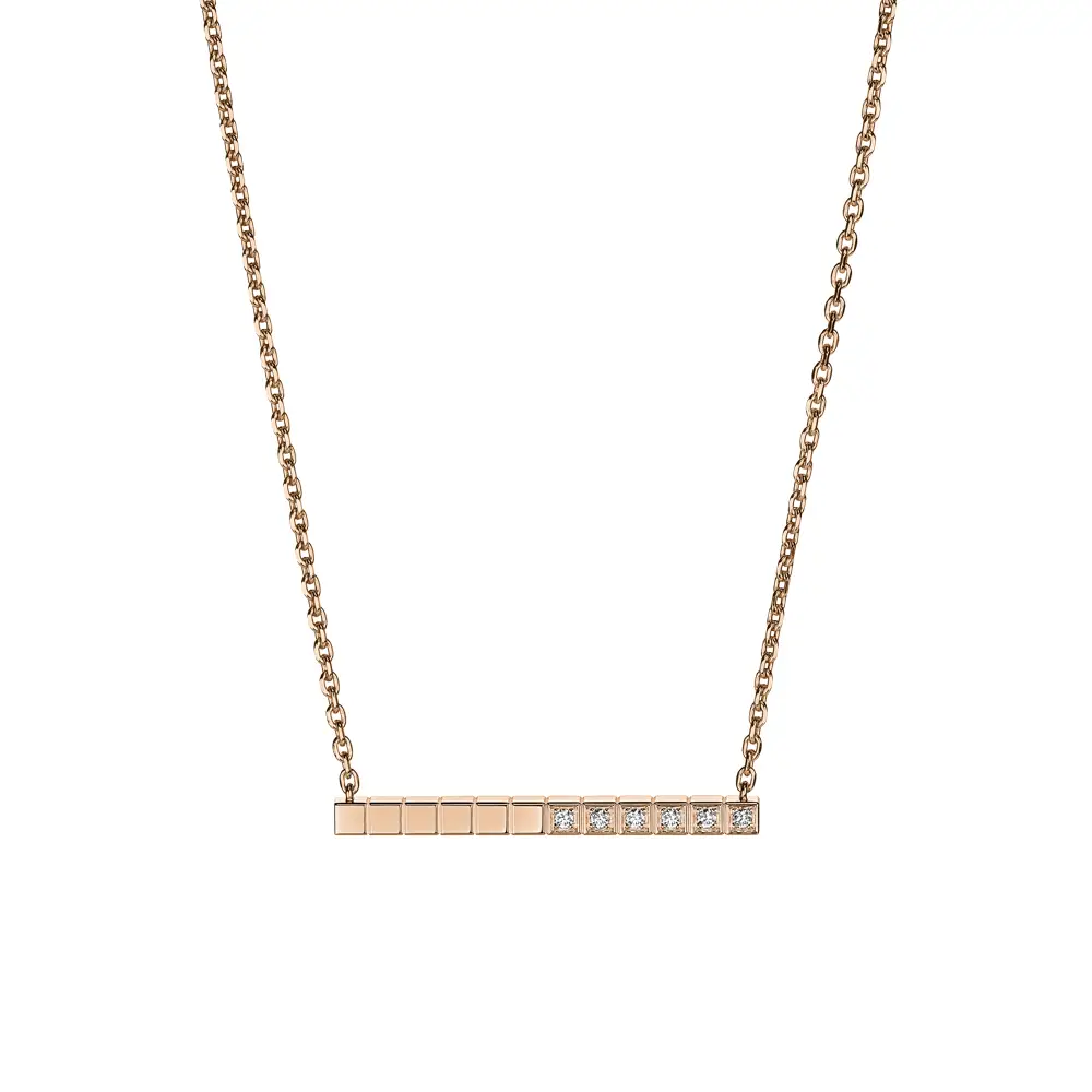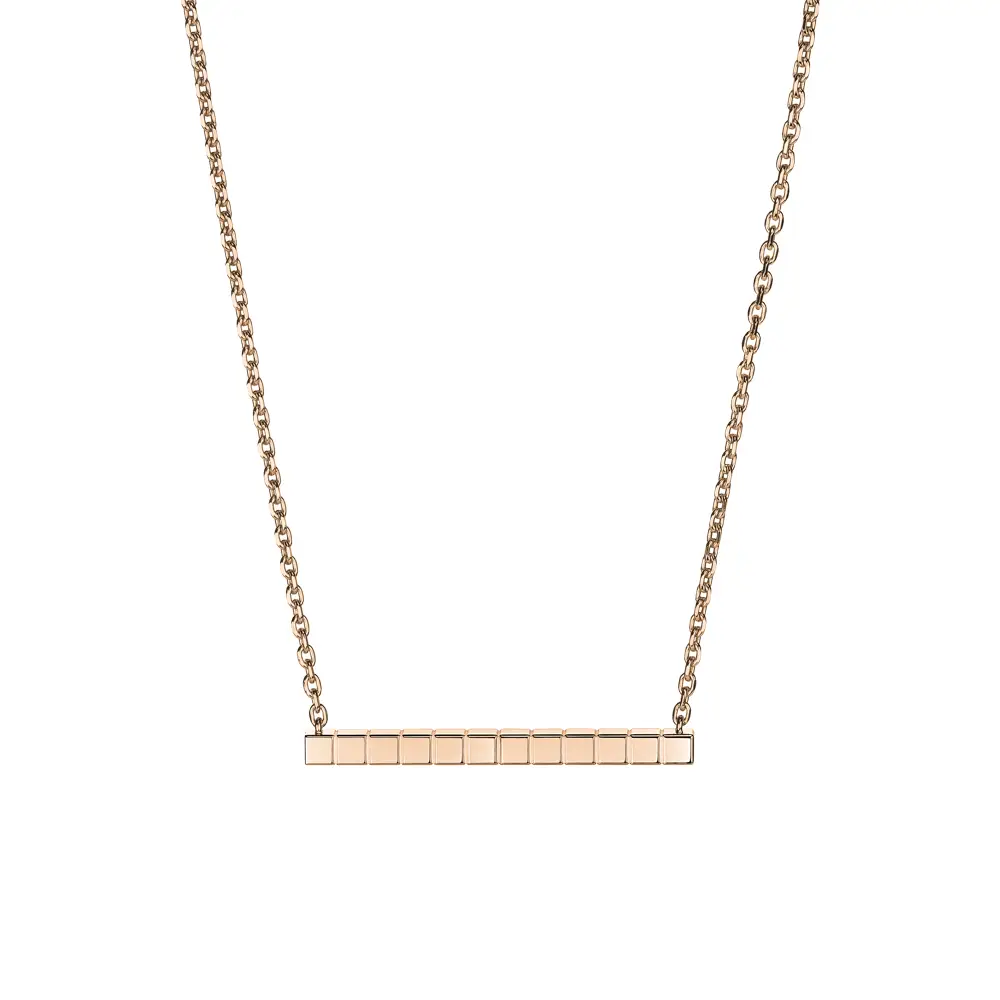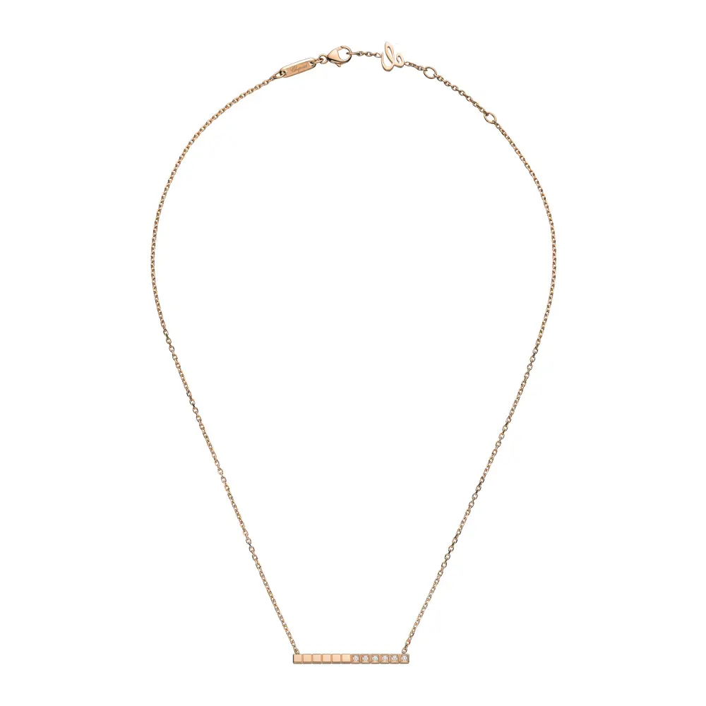 The Chopard Ice Cube 817702-5002 necklace embodies minimalist elegance and architectural purity, true to the spirit of the iconic Ice Cube collection. Crafted from 18kt ethical rose gold, its warm tone enhances the geometric precision that defines this timeless design.