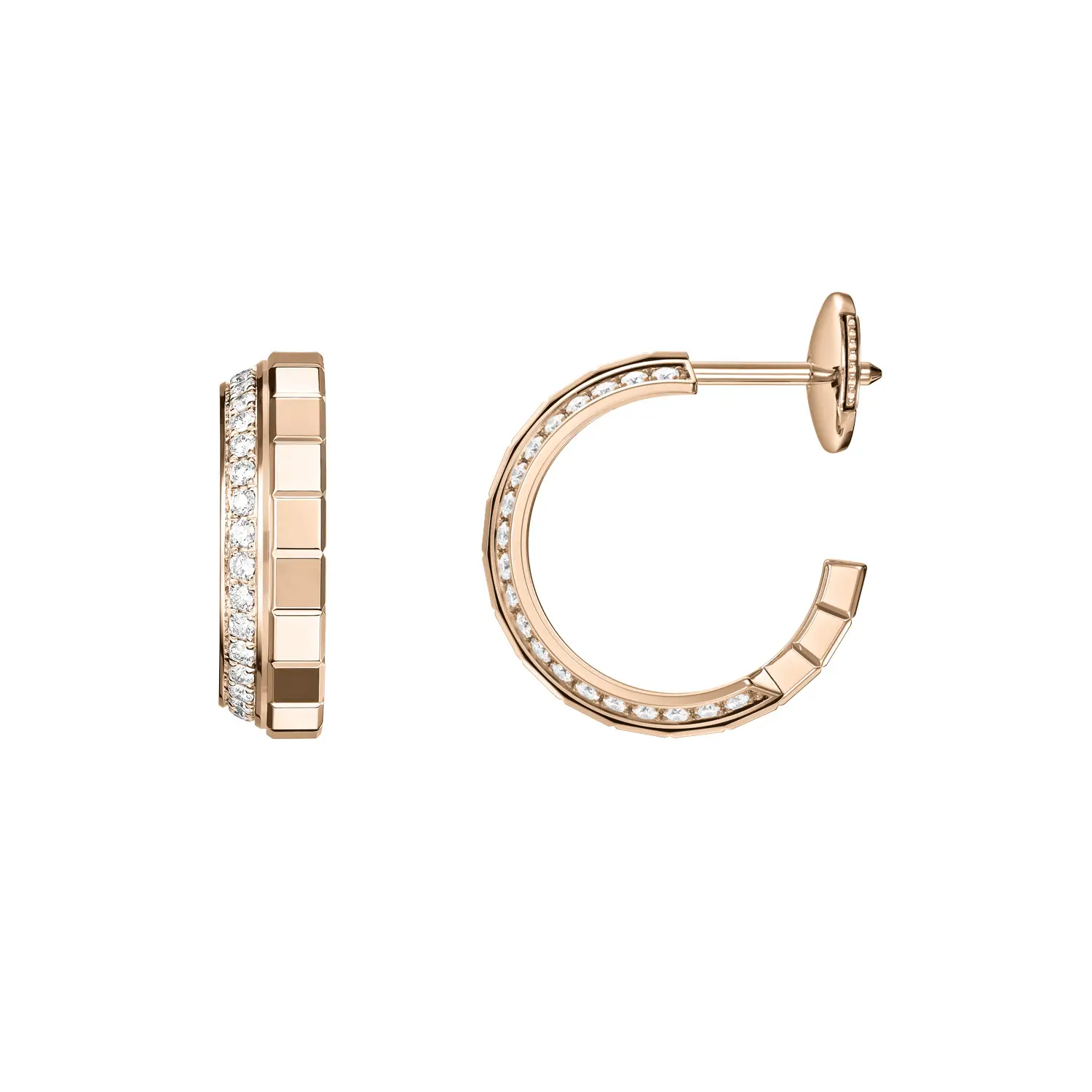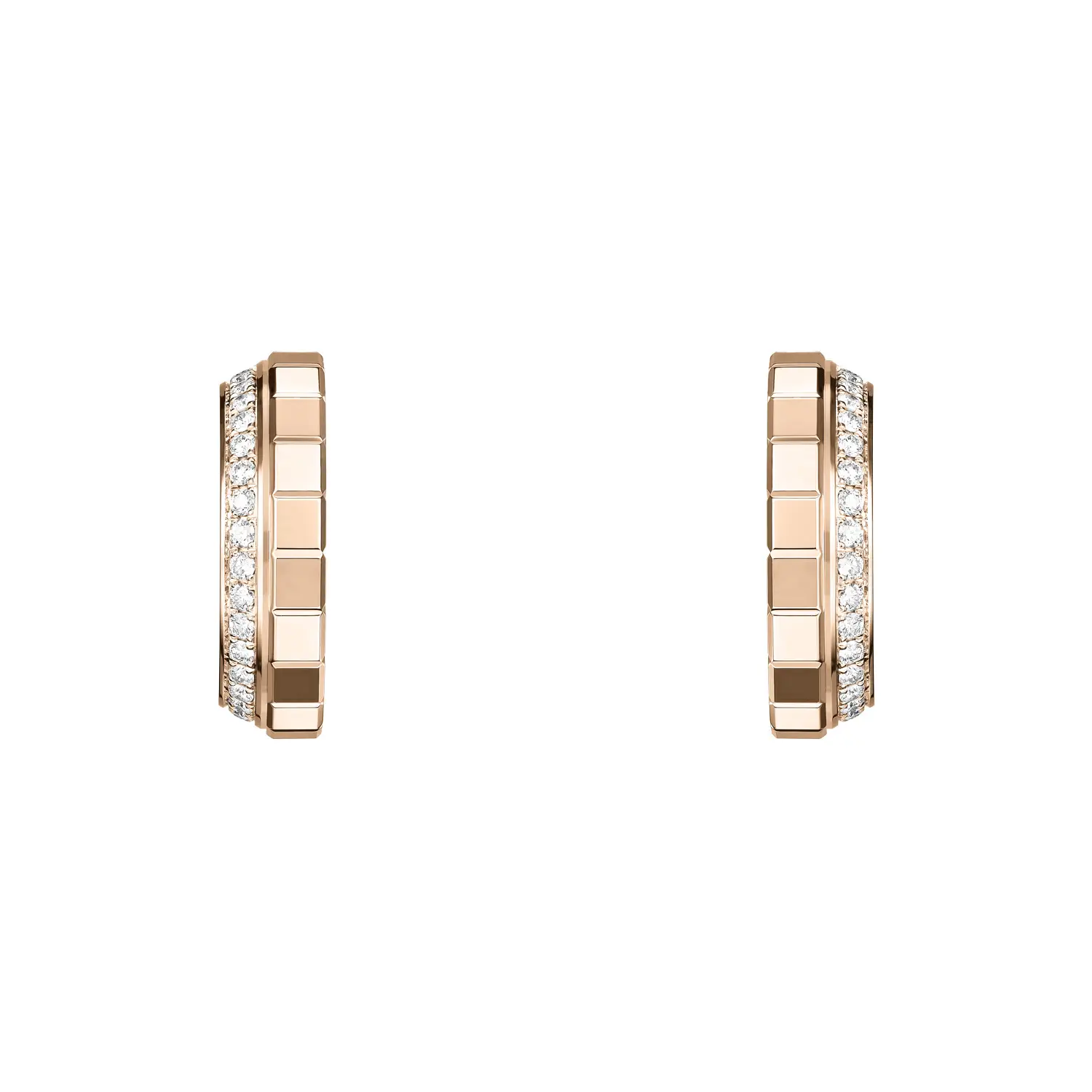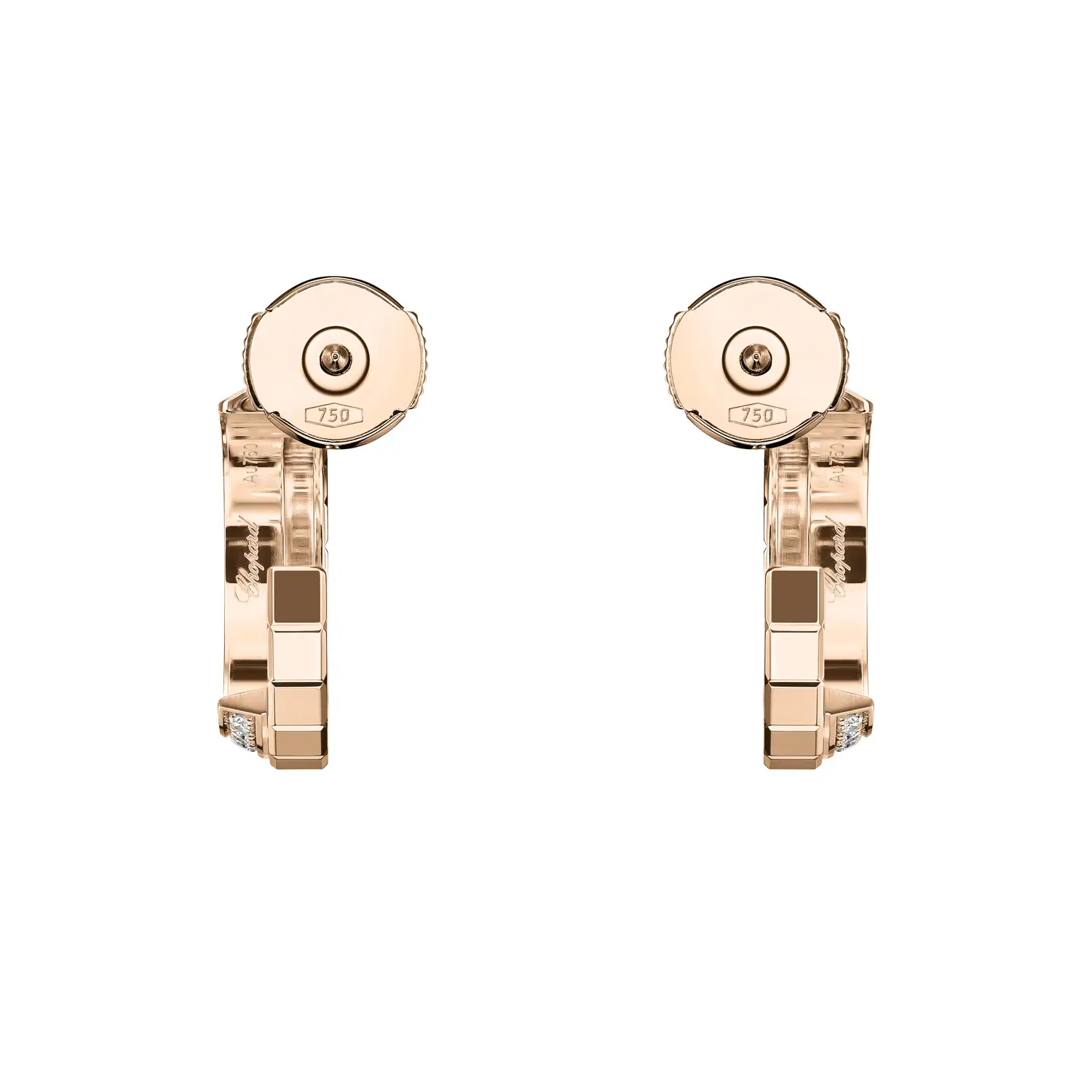 The elegant Chopard Ice Cube 837008-5001 earrings stand out with their modern geometric design inspired by the purity of ice cubes. Each faceted surface crafted from 18k ethical rose gold reflects light beautifully, while diamonds totalling approximately 0.24 ct add a sophisticated sparkle and a distinctly luxurious character.