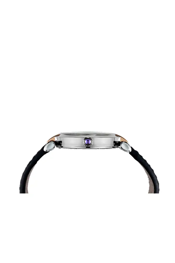 The 36 mm stainless steel case is enhanced with 18-carat rose gold accents, giving the watch a warm and luxurious glow. Beneath the scratch-resistant sapphire crystal, the silver dial with a mother-of-pearl center radiates soft iridescent tones, while the crown is adorned with the signature amethyst cabochon, a hallmark of the Imperiale line.
