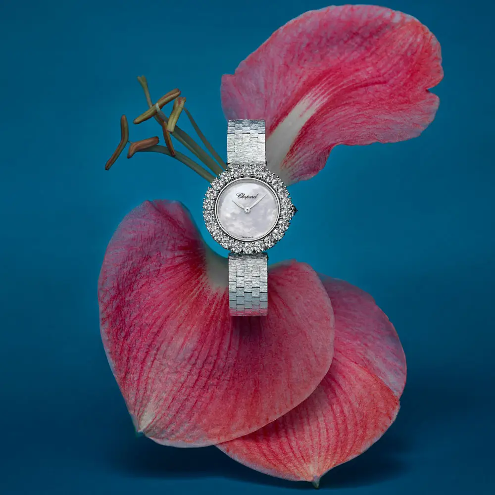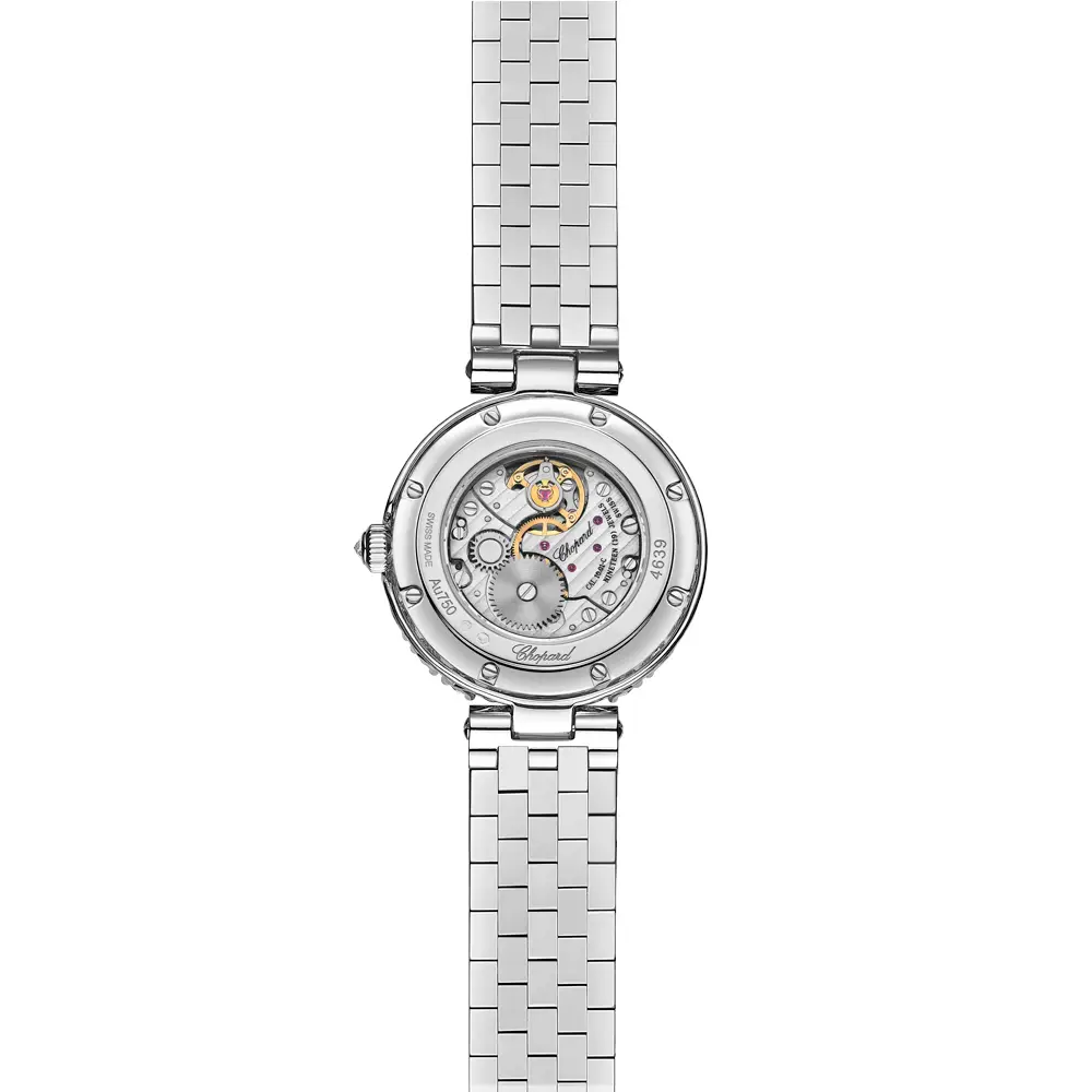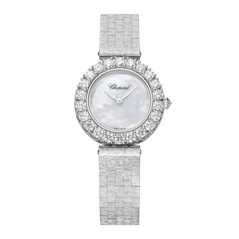 Inside beats the hand-wound mechanical movement Chopard Calibre 10.01-C, providing a 45-hour power reserve and remarkable precision. The mother-of-pearl dial captures and reflects light beautifully, while white-gold hands and crown enhance its refined elegance. A sapphire crystal with anti-reflective coating and 30-metre water resistance ensure lasting durability and quality.
