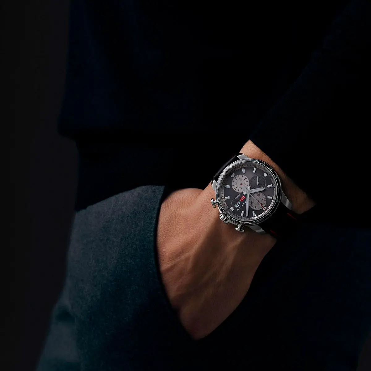 The 44 mm stainless steel case is paired with a steel and aluminium bezel, emphasising the model’s dynamic character. The grey dial with red accents, inspired by racing aesthetics, is protected by an anti-reflective sapphire crystal. Equipped with a chronograph, date window, and luminescent hands, the watch ensures optimal readability in every condition.