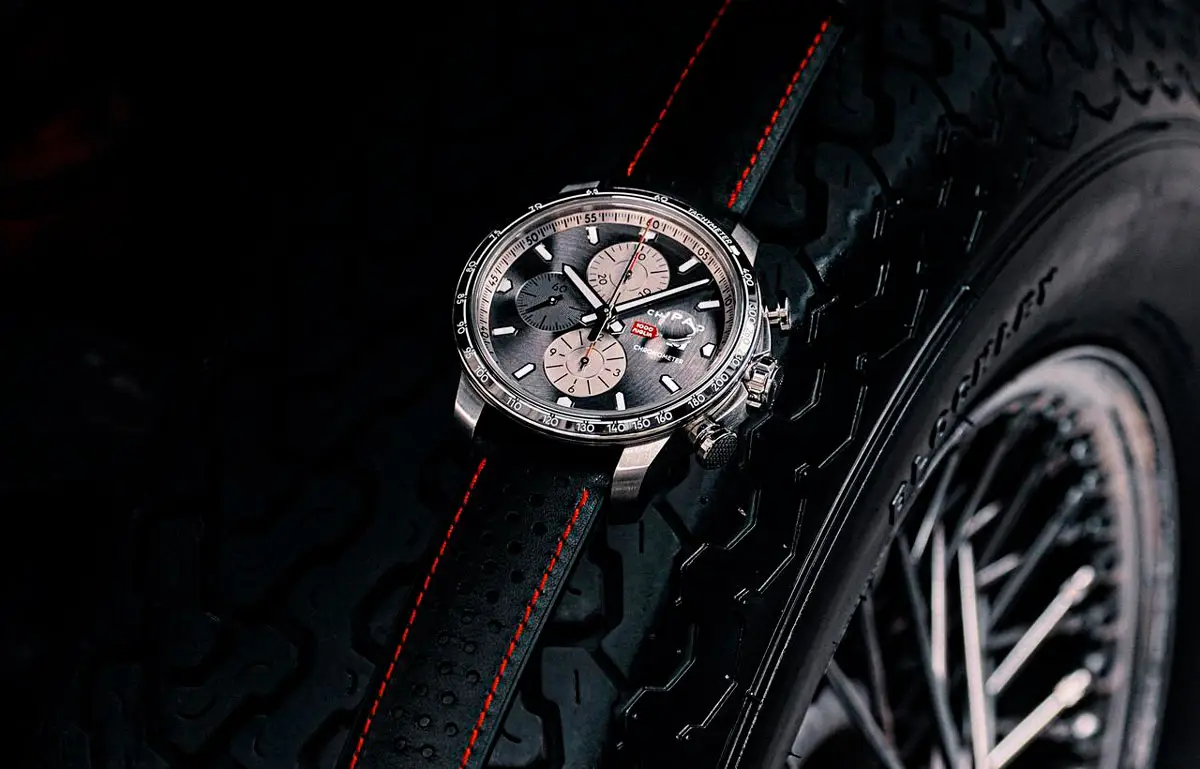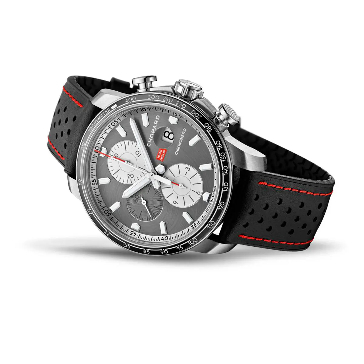 Mille Miglia watches combine the aesthetics of classic cars and high watchmaking technique. The design often references details such as on-board instruments, dials reminiscent of tachometers or straps inspired by Dunlop tyres from the 1960s.