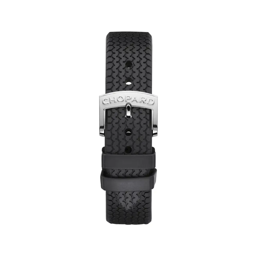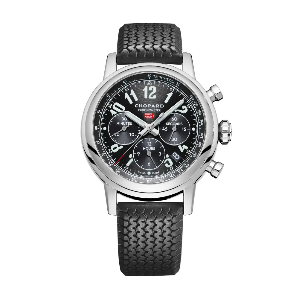 The Chopard Mille Miglia Classic Chronograph blends motorsport passion with fine Swiss watchmaking. The 42 mm round stainless steel case houses a sleek black dial with chronograph and date display, protected by a sapphire crystal with anti-reflective coating.