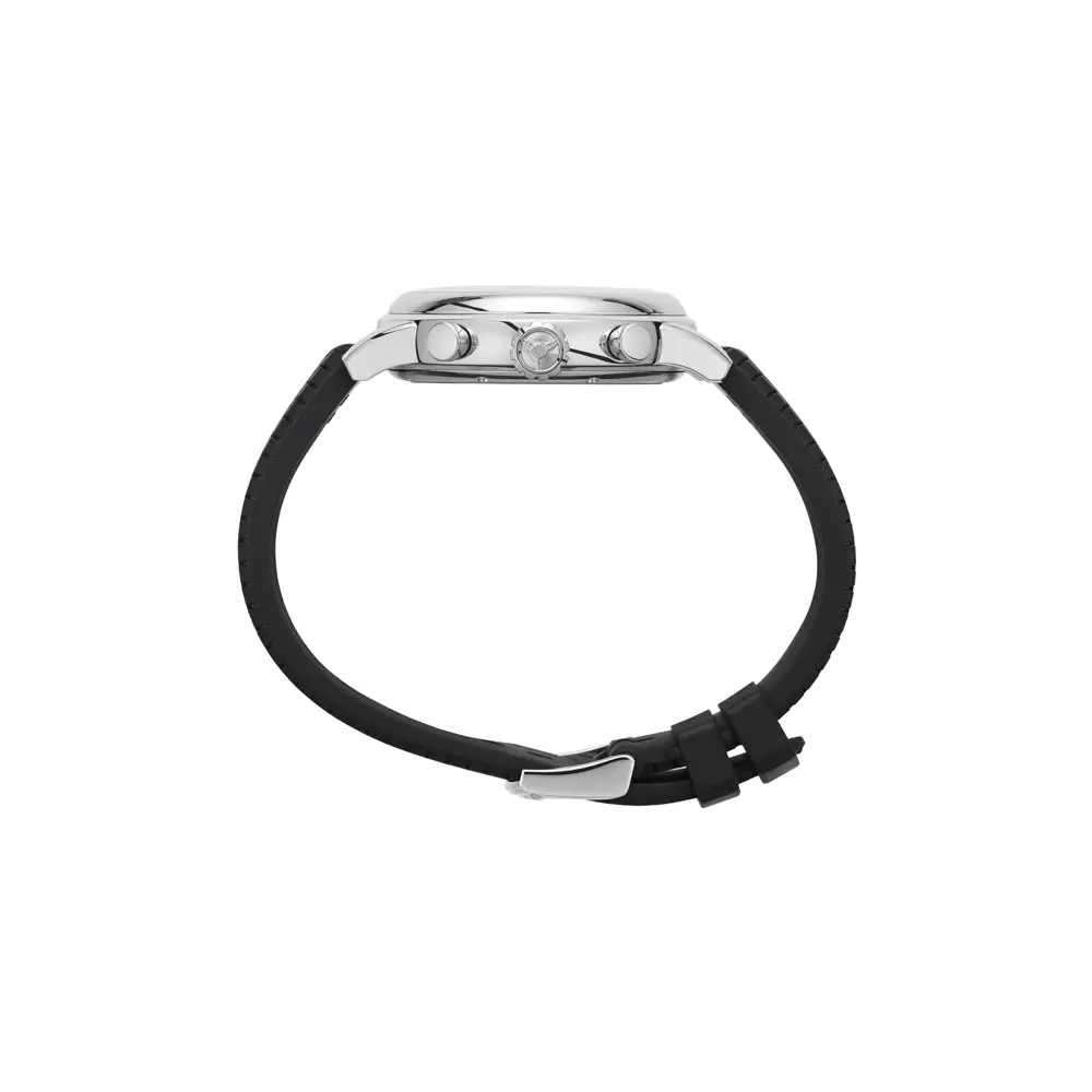 The black rubber strap, inspired by classic Dunlop tire treads, offers comfort and unique racing style, while the pin buckle keeps it secure.