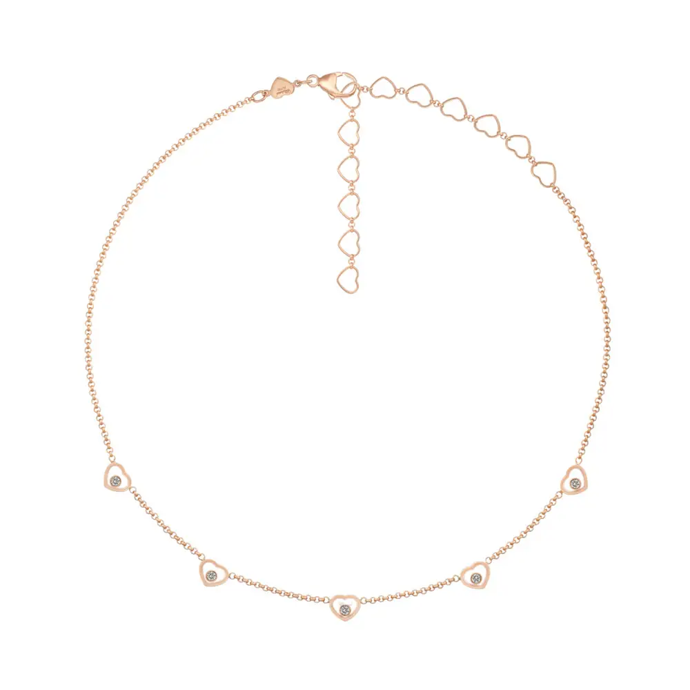 The Chopard My Happy Hearts 81A088‑5501 is a delicate and refined necklace from a collection that celebrates emotion, freedom, and feminine grace. Crafted in 18kt rose gold, it features five heart-shaped motifs, each housing a free-moving diamond suspended between two sapphire crystals. This iconic design sparkles with every movement, adding a soft and elegant glow.