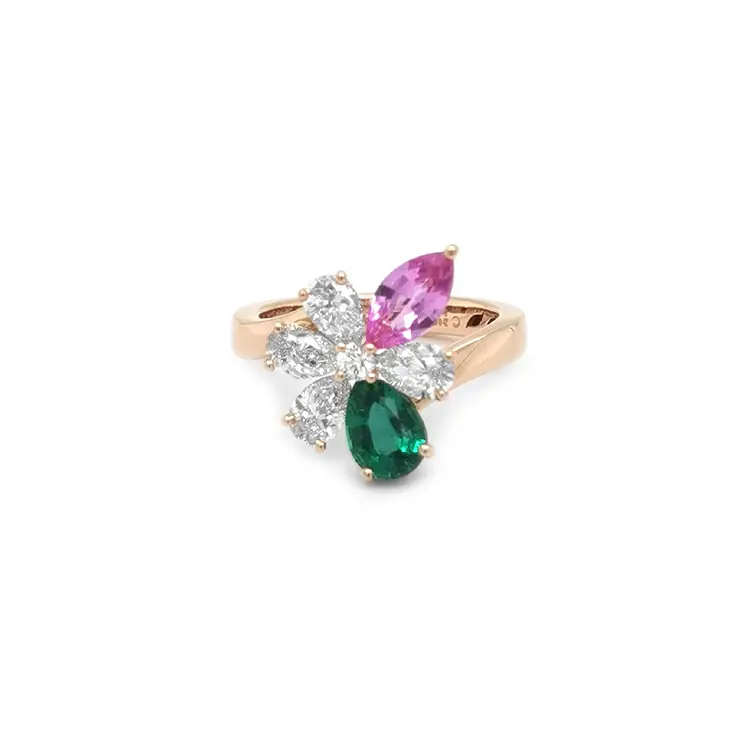 At the center sits a natural green emerald, 0.82 ct, pear (teardrop) cut (7.00 × 5.00 mm), paired with a natural pink sapphire, 0.68 ct, elegant marquise cut (8.40 × 4.40 mm). Their contrasting tones are underscored by a harmony of diamonds—four natural white diamonds in pear cut totaling 1.19 ct (4.65 × 3.50 mm), VS clarity, F color, plus one round diamond 0.06 ct (Ø 2.00 mm), VS2 clarity, F color. The result is a jewel that stands out for its color, originality, and luxurious character.