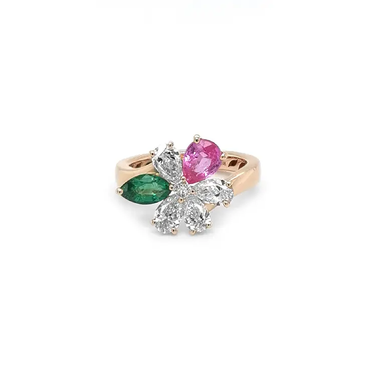 Taking center stage are two colored gemstones—a natural pink sapphire, 0.90 ct, pear (teardrop) cut (6.00 × 5.00 mm) and a natural green emerald, 0.43 ct, also pear cut (6.90 × 4.20 mm). Their contrasting hues are framed by four natural white diamonds totaling 1.21 ct, pear cut (4.70 × 3.70 mm), VS clarity, F color, complemented by one round diamond, 0.06 ct (Ø 2.50 mm), also VS clarity, F color. The result is a ring that unites playfulness, luxury, and original elegance.