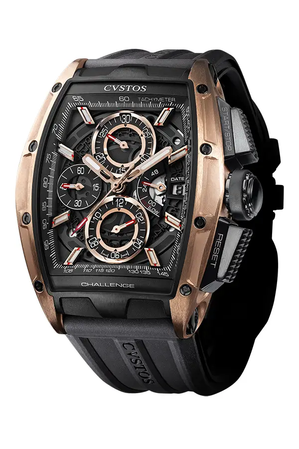 Men's watch from the Chrono II sports model series, which comes from the creative workshop of the Cvstos brand. It is water-resistant up to a depth of 100 metres, so it is suitable for swimmers. The black rubber strap is suitably complemented by a titanium and 18k rose gold case. The watch has functions such as a chronograph and date display.