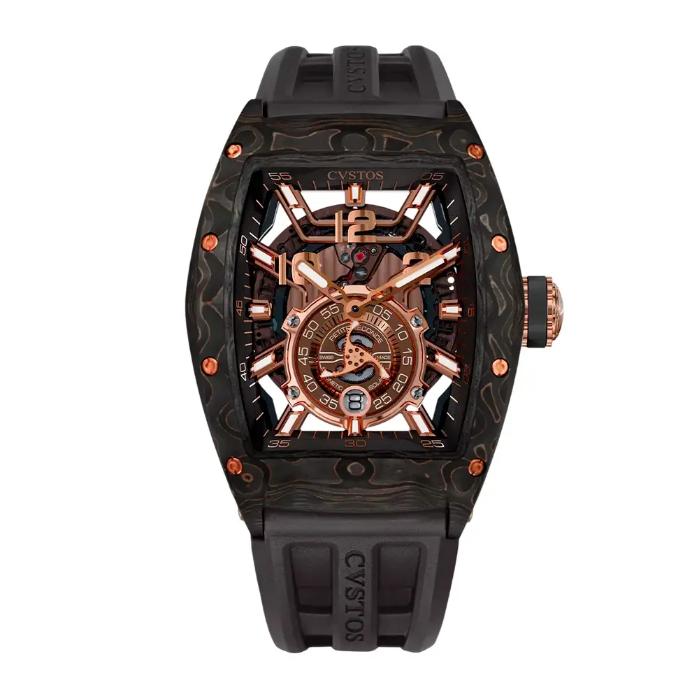 The Cvstos Jetliner PS 5N Carbon / Oro Carbon showcases the perfect fusion of advanced materials, technical mastery, and contemporary aesthetics. Its 53.7 × 41 mm tonneau-shaped case, crafted from carbon composite with 5N rose gold accents, combines strength, lightness, and refined luxury — hallmarks of the Jetliner collection’s aeronautical inspiration.
