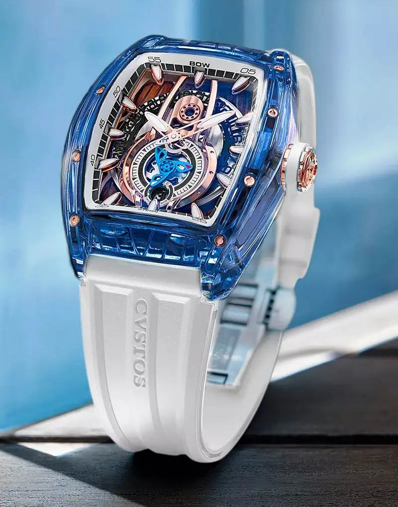 The CVSTOS Sealiner PS Blue Sapphire Black Dial C00103.4182001 is a striking expression of modern luxury and technical mastery, crafted for those who dare to stand out. With its bold tonneau-shaped case measuring 53.7 x 41 mm, made entirely of transparent blue sapphire, this timepiece is a true jewel among contemporary watch creations.