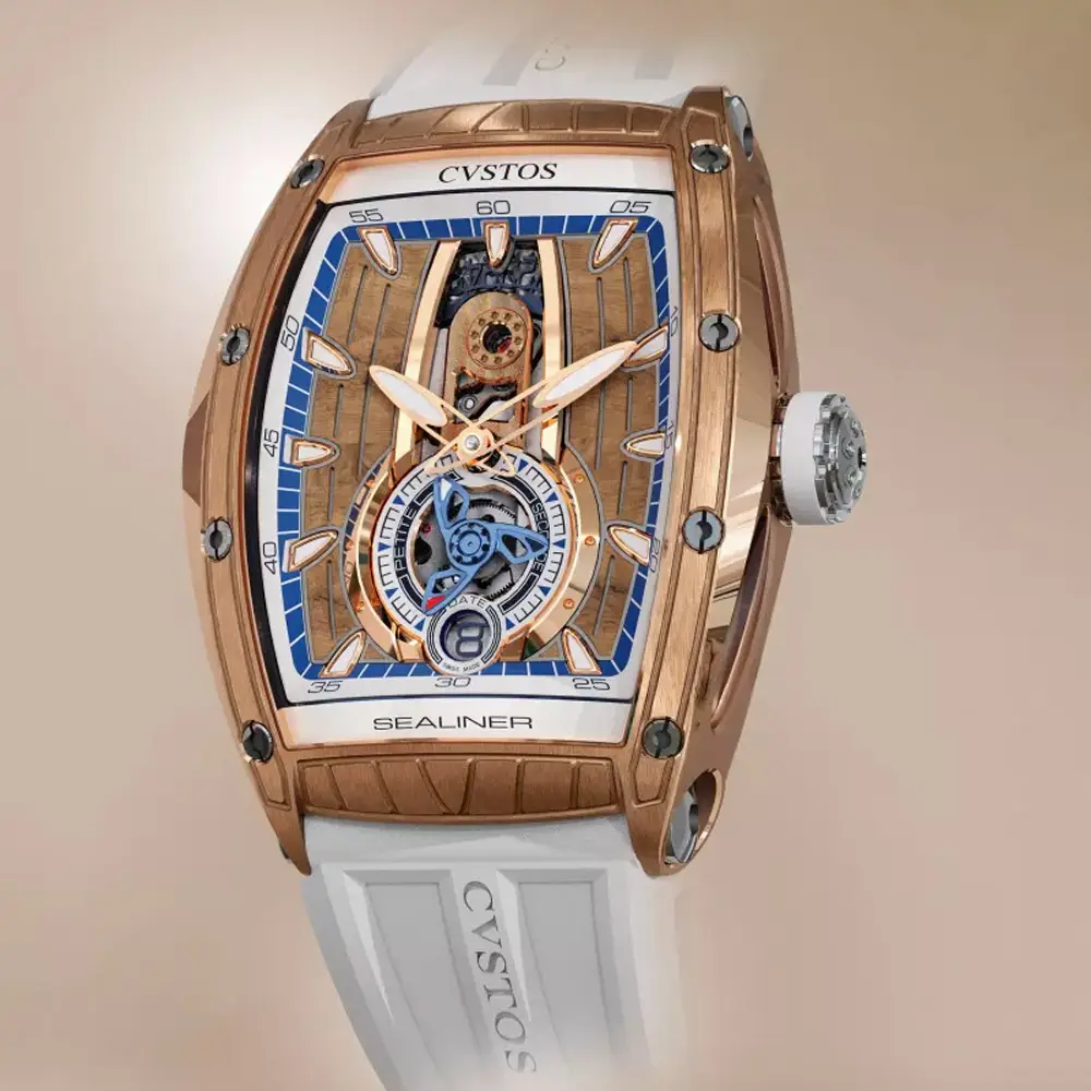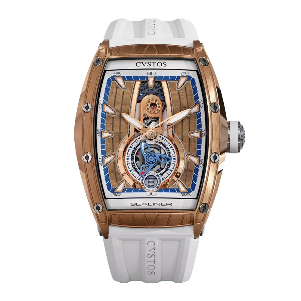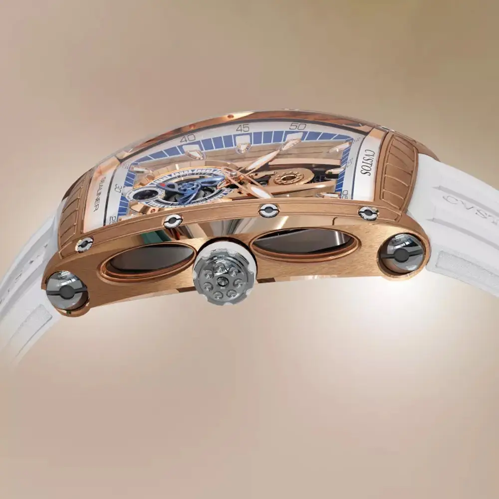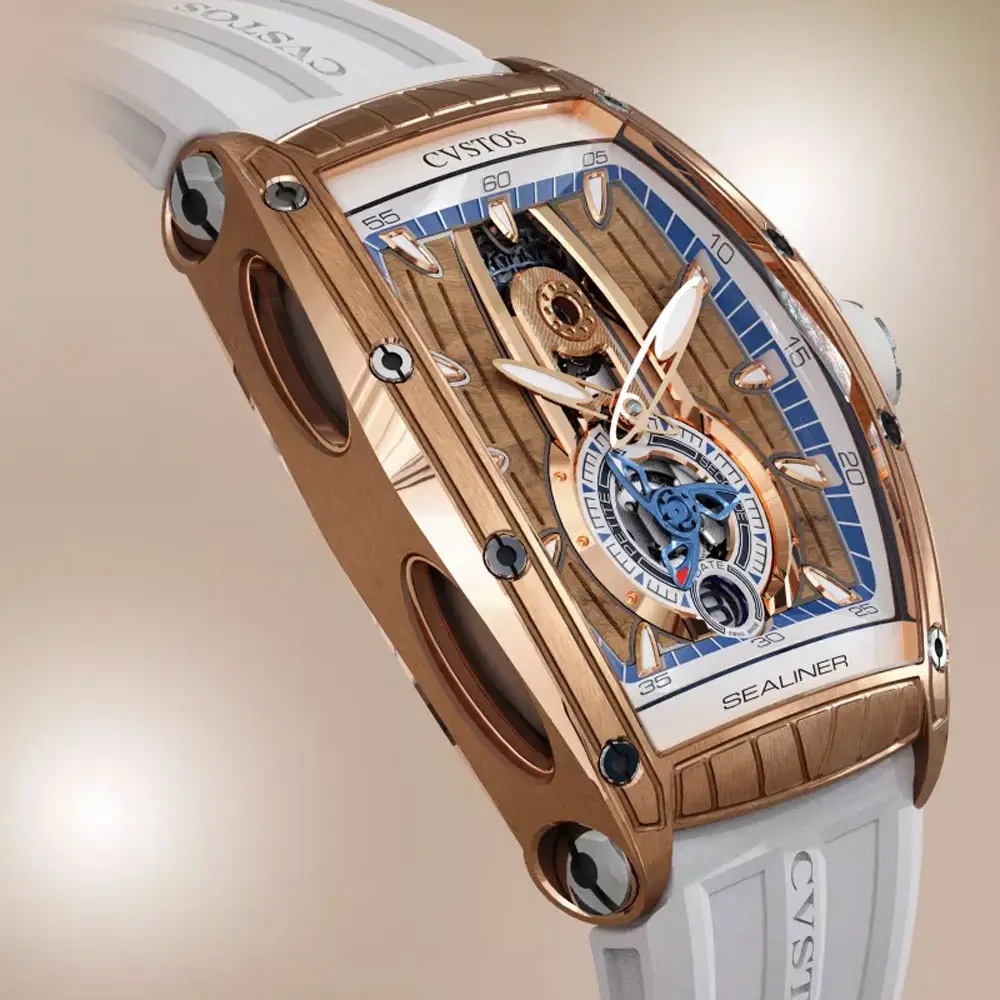 The CVSTOS Sealiner PS Thirty6 5N Red Gold/Titanium blends contemporary watchmaking aesthetics with refined nautical inspiration characteristic of the Sealiner collection. Its 47.2 × 36 mm tonneau-shaped case combines precious 5N red gold with titanium details that enhance durability and introduce a subtle sportiness. The blue skeletonised “Sky Blue” dial reveals the intricate mechanics within, adding impressive visual depth highlighted by luminescent hands and hour markers.