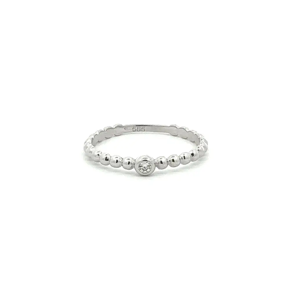 The delicate gold ring with a central zircon captivates with a clean and lightweight design that highlights natural elegance. The beaded band gives the ring a modern yet playful character, while the central zircon adds a subtle sparkling accent. Thanks to its minimalist style, it is ideal for everyday wear as well as stacking with other rings.