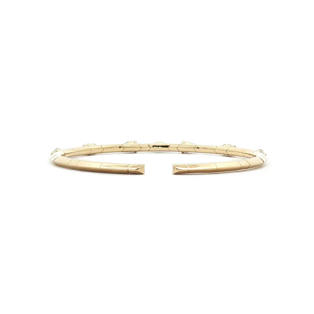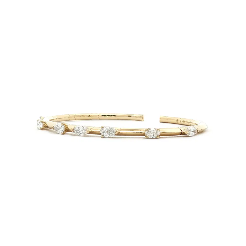 This solid 18kt yellow gold cuff bracelet combines timeless elegance with contemporary design. The minimalist gold line is adorned with seven diamonds in refined cuts – oval, marquise, and pear – creating a dazzling play of light.