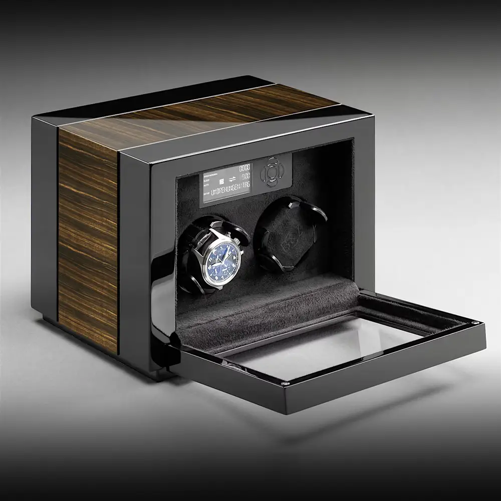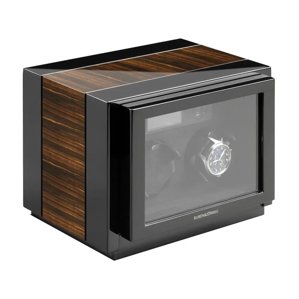The Buben & Zorweg VANTAGE 2 Macassar watch winder combines German precision engineering with timeless luxury. This exclusive model, designed for two automatic watches, stands out with its elegant design that merges high-gloss black lacquer with refined Macassar wood detailing. The safety glass front lid allows for a stylish presentation of your timepieces, while the lockable system and soft velour interior ensure maximum protection and comfort for your collection.