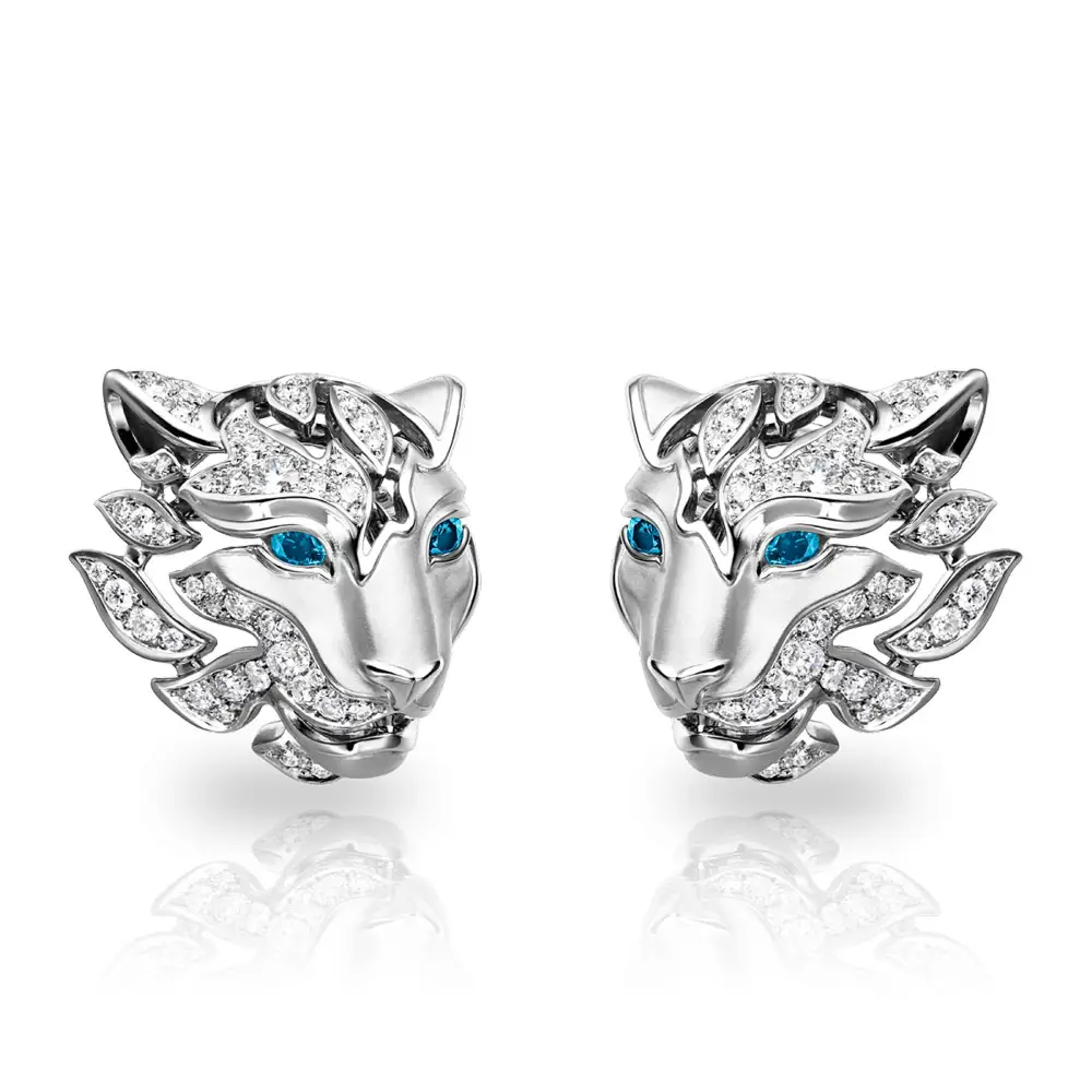 It is decorated with 88 brilliant diamonds weighing a total of 0.81 ct, which add radiance and refinement to the motif. Striking blue diamonds weighing 0.23 ct serve as the eyes of the two beasts, lending them an intense look full of power and character. The earrings look confident while retaining their delicacy and wearability for both everyday and formal occasions.