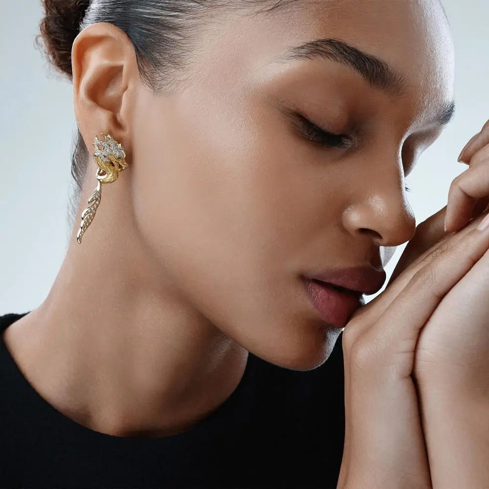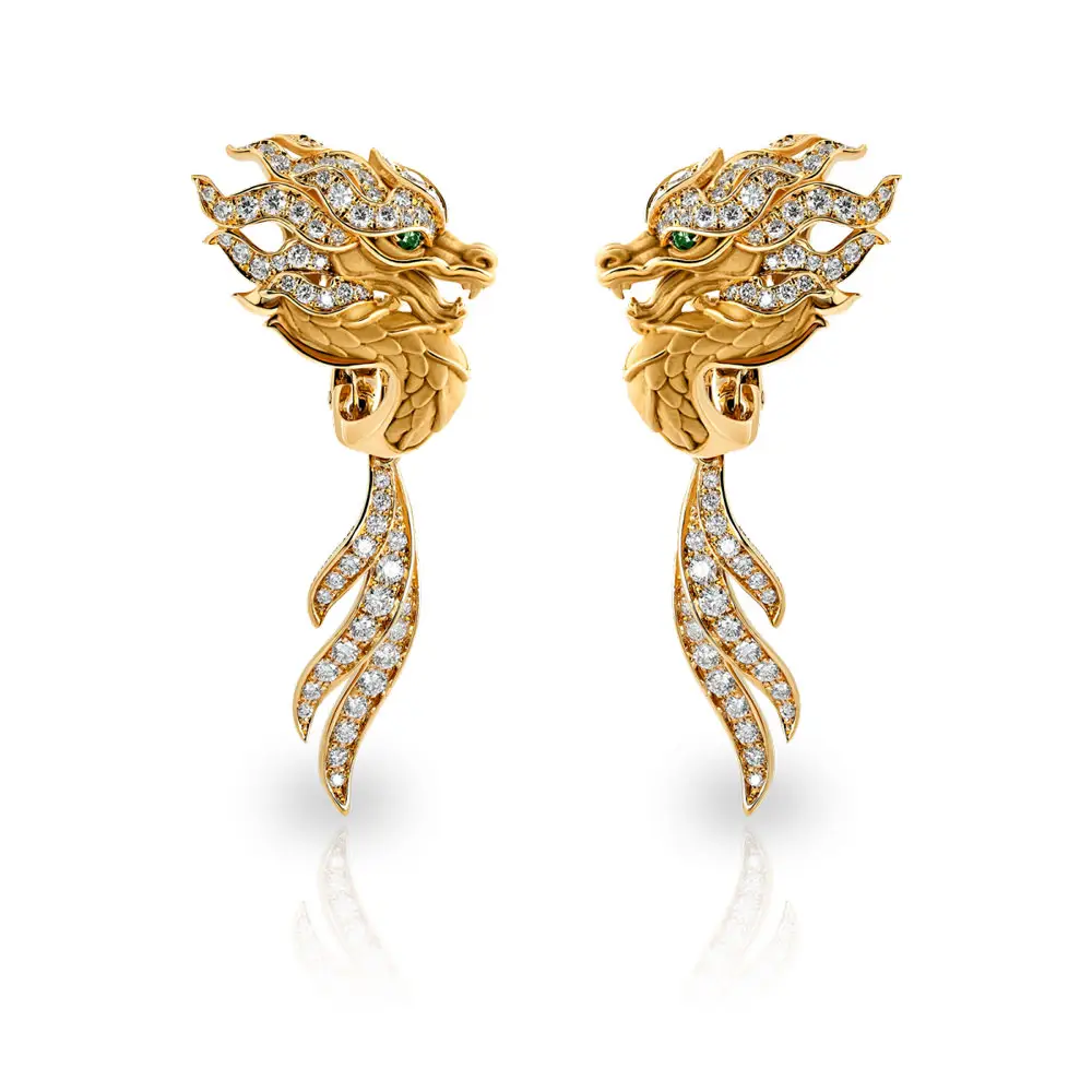 A striking detail is the four green diamonds weighing a total of 0.07 ct, which serve as the eyes of dragons and lend the jewel a unique look - vivid, powerful and unmissable. The graceful curve of the "dragon's mane" creates an elegant downward extension, making the earrings look dynamic and sensual.