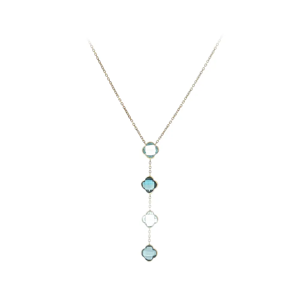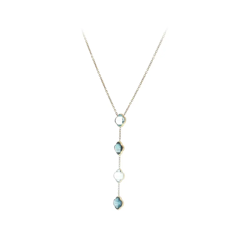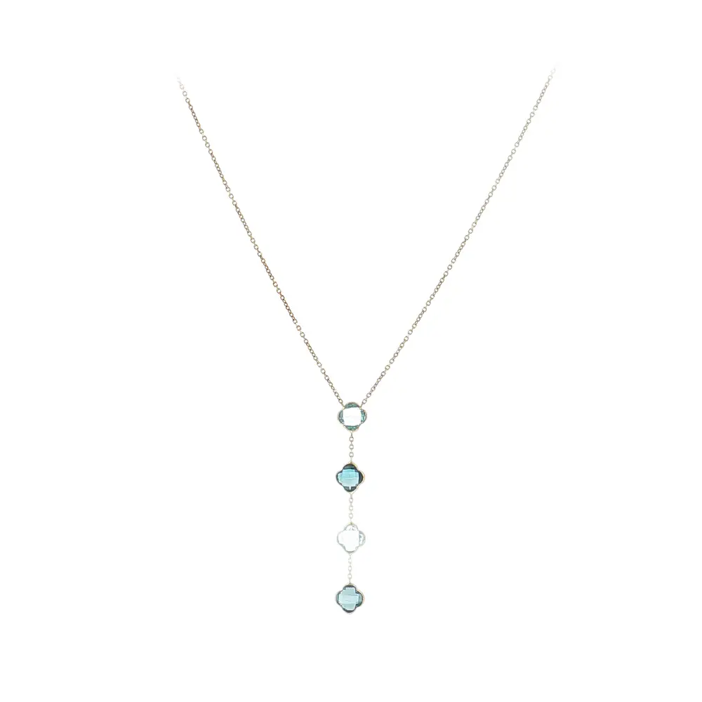 The fine chain is complemented by a drop pendant with blue stones, beautifully enhancing the neckline and adding feminine charm to any outfit. The combination of classic gold and cool blue tones creates a harmonious look that pairs easily with other jewelry.