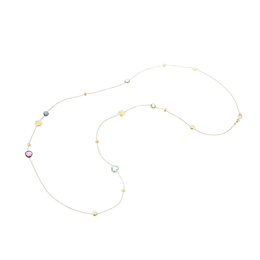 Treat yourself to a piece that highlights your personality or surprise your loved ones with a special gift. The gold necklace with colorful stones and hearts symbolizes playful elegance, femininity, and timeless style.