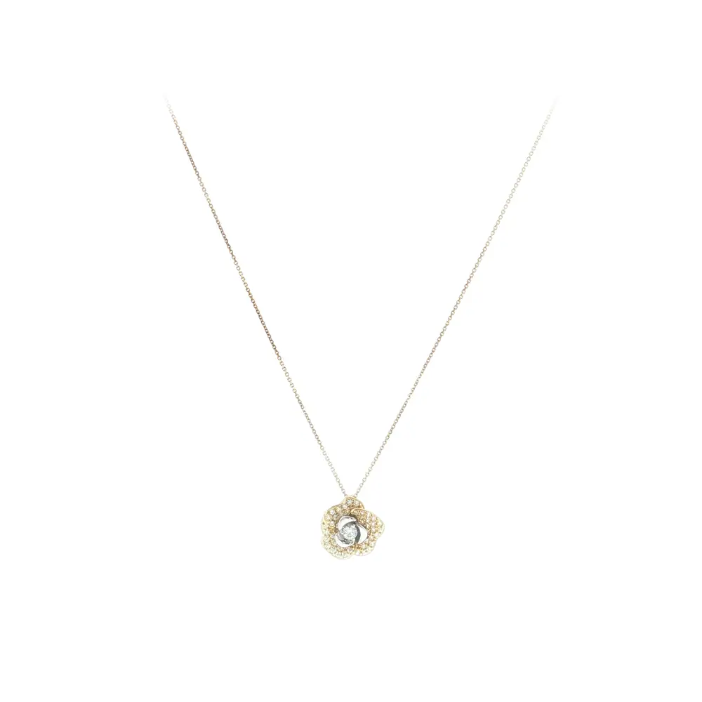 An elegant necklace made of yellow and white gold with a delicate floral motif captures attention with its precise craftsmanship and timeless design. Sparkling zirconia add brilliant shine and enhance its luxurious look.