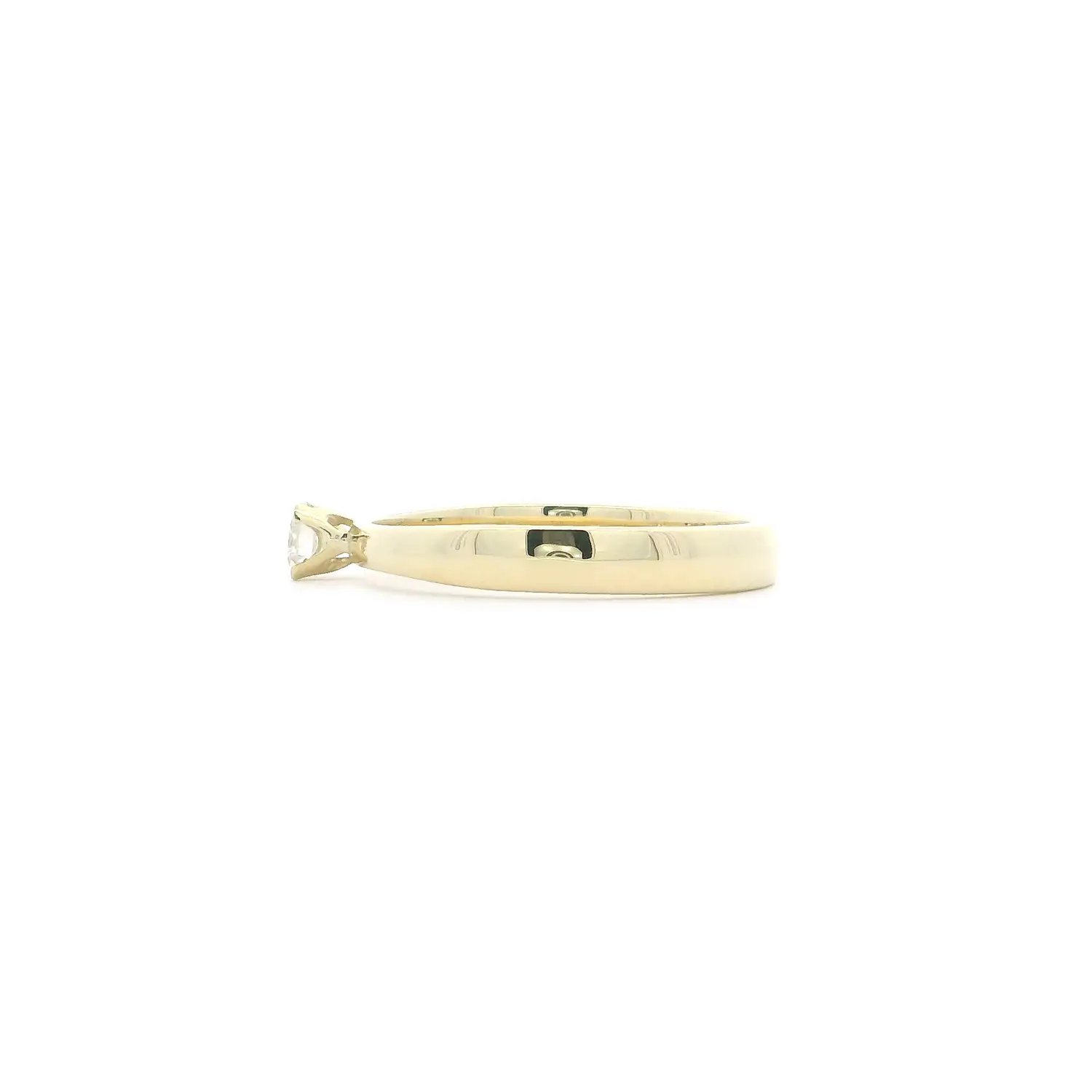This yellow gold engagement ring embodies timeless elegance and pure love. Its classic design highlights the natural beauty of the brilliant-cut diamond weighing 0.14 ct, radiating a soft and refined sparkle.